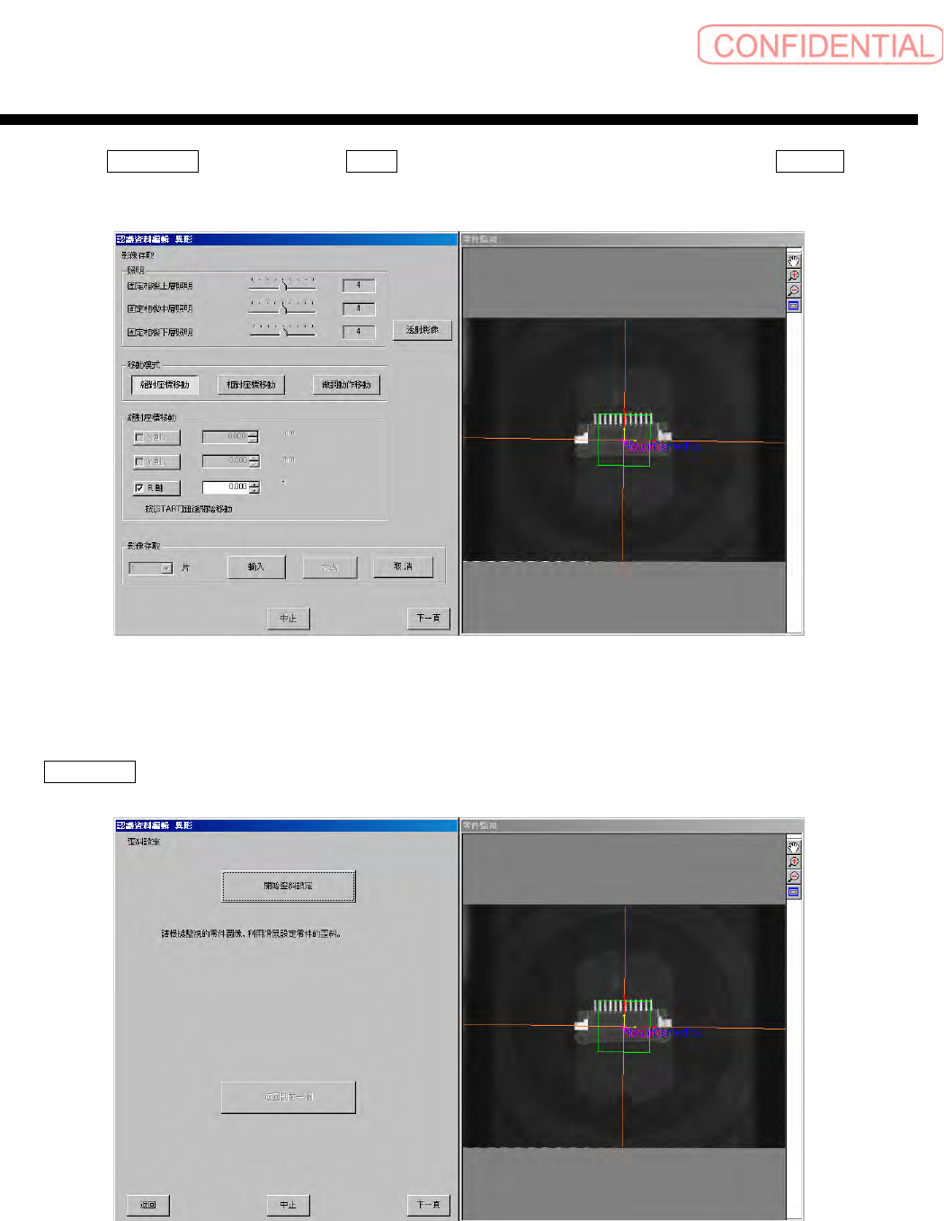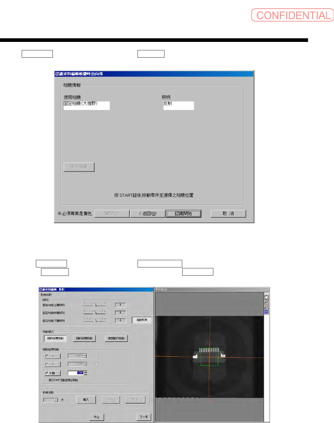 零件认识资料制作篇 零件认识资料制作篇 零件认识资料制作篇 零件认识资料制作篇 第 2 章 顺序 2-40 SI-F130/SI-F 209 会出现 認識開始 ( 认识开始 ) 画面,所以按 ST AR T 钮,将欲吸着的零 件向指示的相机位置移动。 图 1.6- 5 認識開始 ( 认识开始 ) 画面 然后,点击 認識開始 ( 认识开始 ) 钮,调出 認識資料編輯 ( 认识资料 编辑 ) 画面。 (请一定要用 ST AR T 钮,将零件…