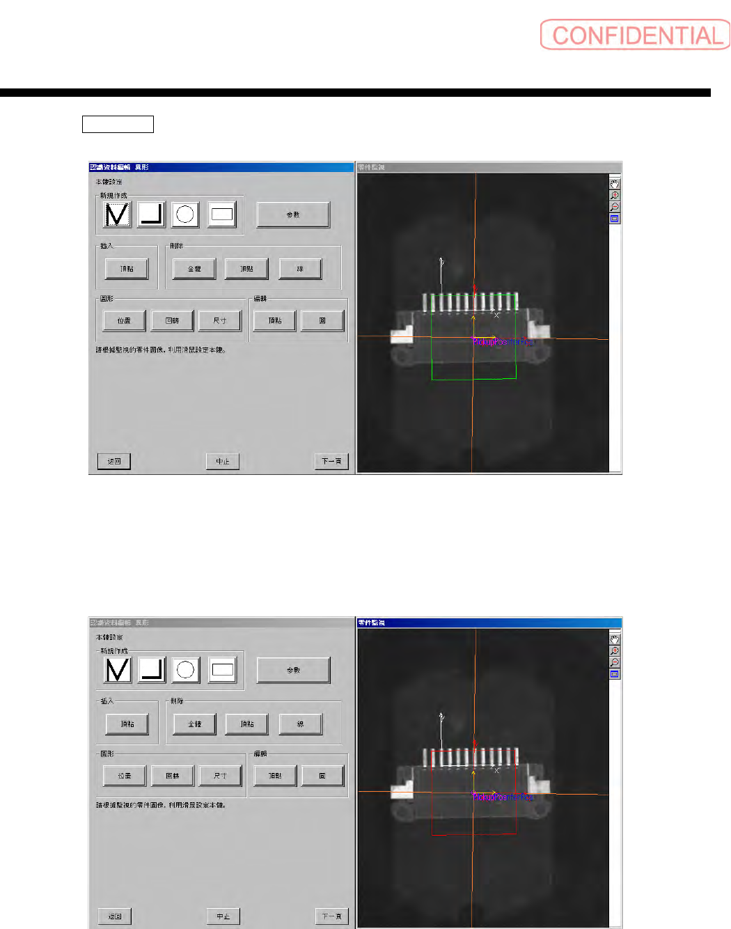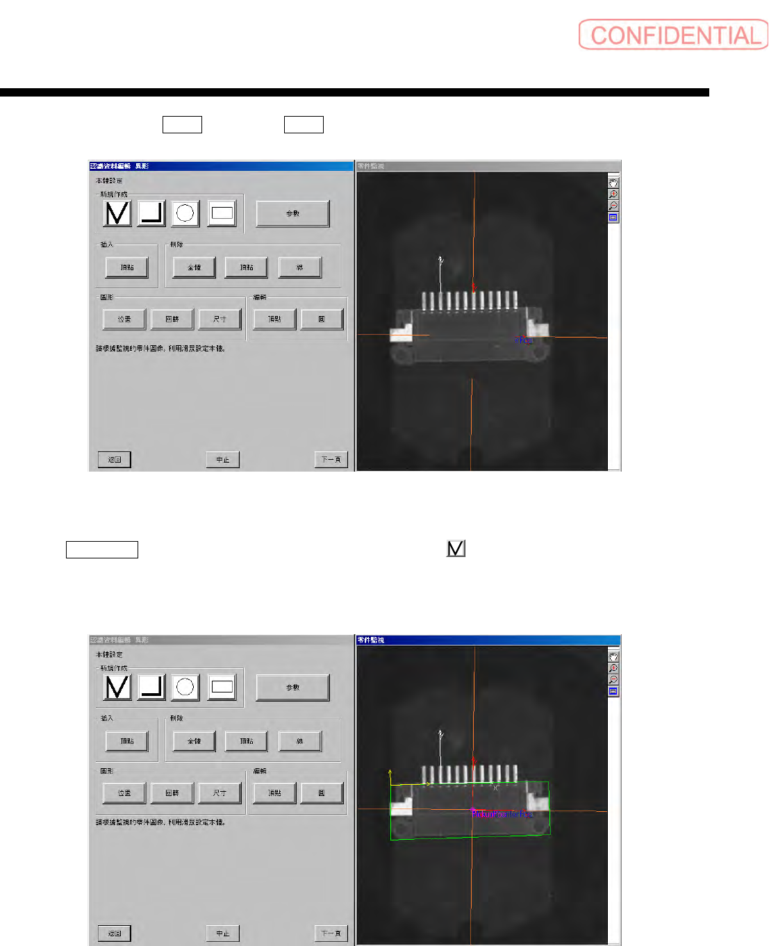 零件认识资料制作篇 零件认识资料制作篇 零件认识资料制作篇 零件认识资料制作篇 第 2 章 顺序 SI-F130/SI-F 209 2-43 会出现异型 本體設定 ( 本体设定 ) 画面。 图 1.6-8 本體設定 ( 本体设定 ) 画面 首先,不要用缺省显 示的长方形的资料,点击监 视器的长方形线,选择 ( 红线 ) 。 图 1.6-9 缺省图形的删 除