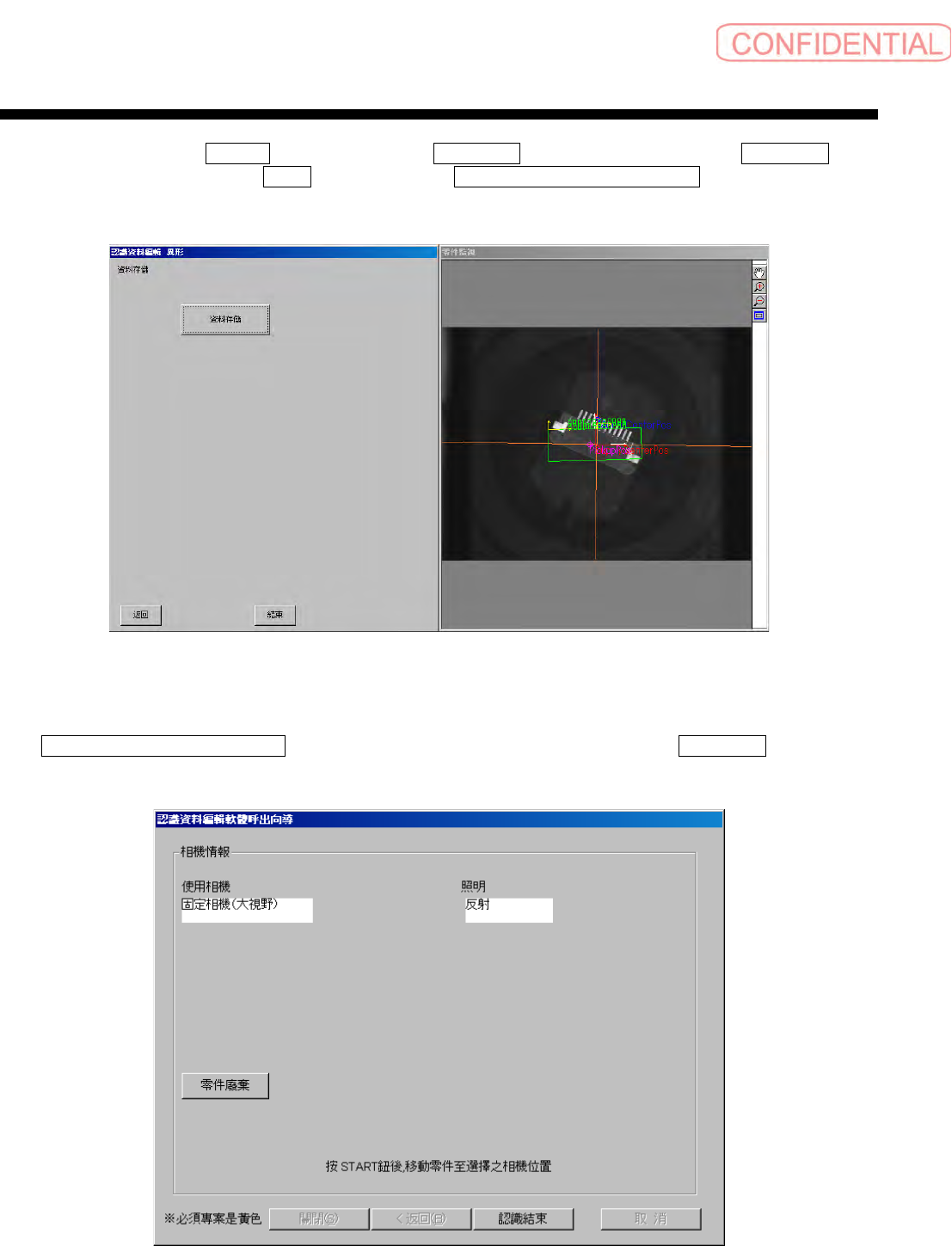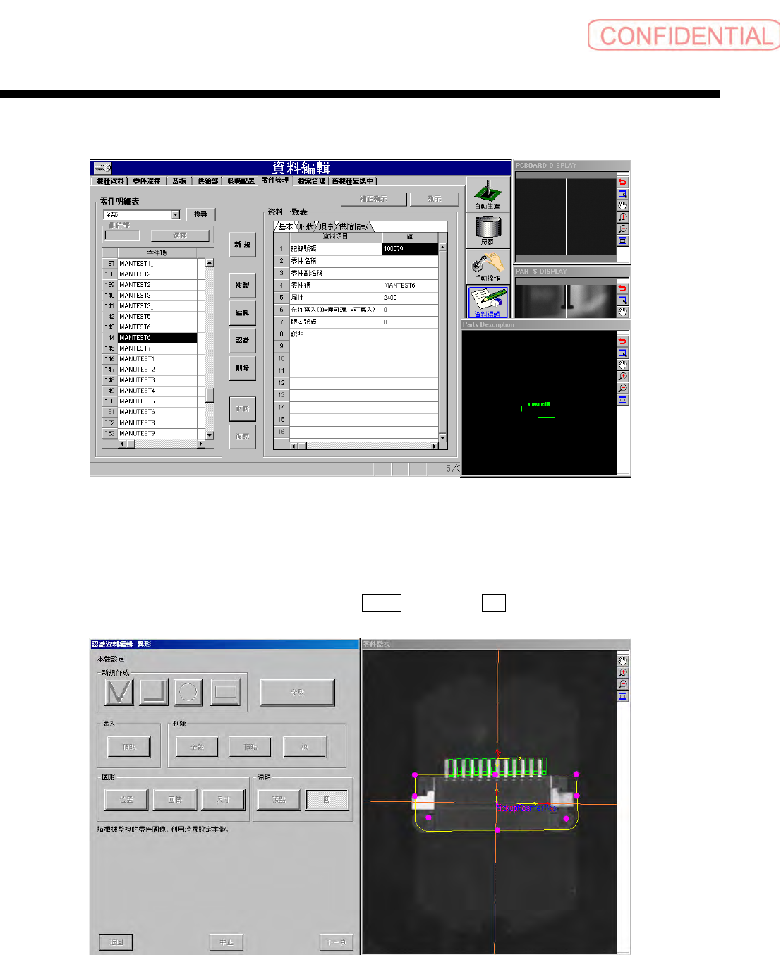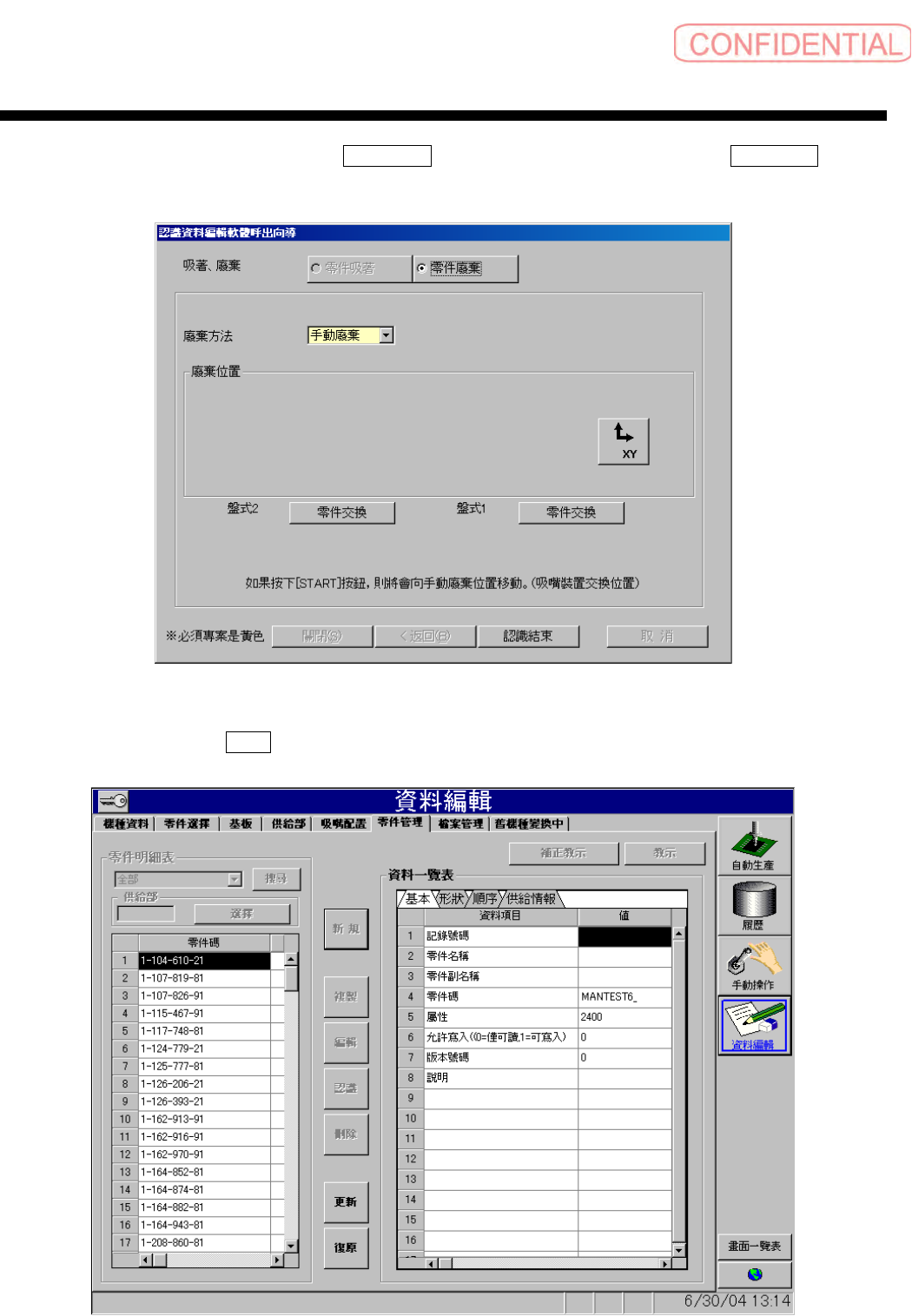 零件认识资料制作篇 零件认识资料制作篇 零件认识资料制作篇 零件认识资料制作篇 第 2 章 顺序 SI-F130/SI-F 209 2-51 为了将认识的零件从 吸嘴上取下,执行 零件廢棄 ( 零件废弃 ) 。取下零件后,点击 認識結束 ( 认识 结束 ) 。 图 1.6-23 零件廢棄 ( 零件废弃 ) 画面 返回零件管理画面, 点击 更新 ( 更新 ) 钮,将数据写 入零件管理表里。 图 1.6-24 零件管理 - 更新 ( 零件管…