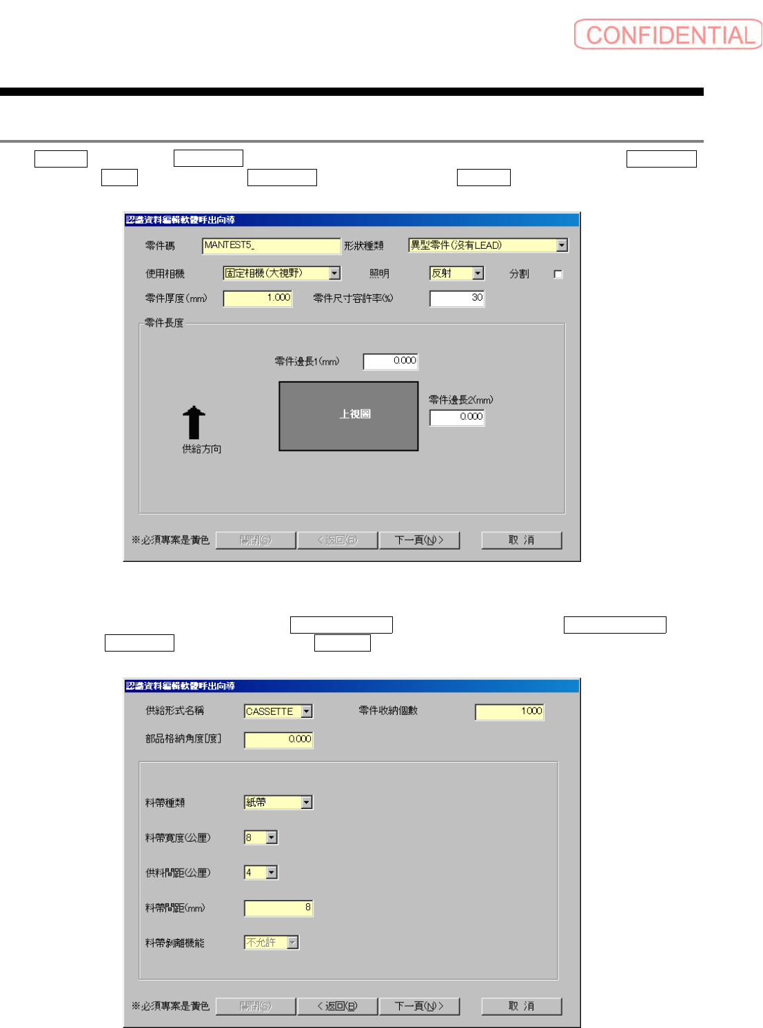 零件认识资料制作篇 零件认识资料制作篇 零件认识资料制作篇 零件认识资料制作篇 第 2 章 顺序 2-54 SI-F130/SI-F 209 1.7 异型 (无 脚)零件的数据制 作 异型 (无 脚)零件的数据制 作 异型 (无 脚)零件的数据制 作 异型 (无 脚)零件的数据制 作 输入 零件碼 ( 零件码 ) , 形狀種類 ( 形状种类 ) 选择异型零件 (没有 LEAD )零件,选择 使用相機 ( 使用相机 ) 、 照明 ( 照明…