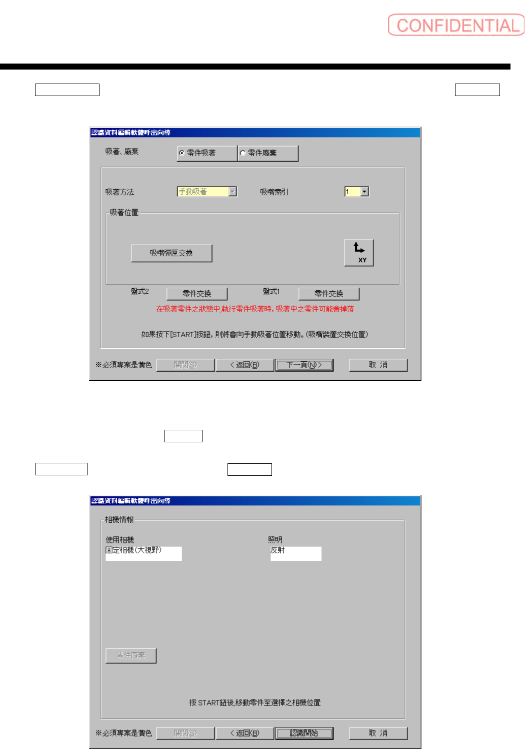 零件认识资料制作篇 零件认识资料制作篇 零件认识资料制作篇 零件认识资料制作篇 第 2 章 顺序 2-56 SI-F130/SI-F 209 然后,点击 認識開始 ( 认识开始 ) 钮,调出 認識資料編輯 ( 认识资料 编辑 ) 画面。 (请一定要用 ST AR T 钮,将零件移动至相机位置后,执 行 認識開始 ( 认识开始 ) 。) 图 1.7-5 認識資料編輯 ( 认识资料 编辑 ) 画面 首先,点击 影像存取 ( 影像存取 ) 的…