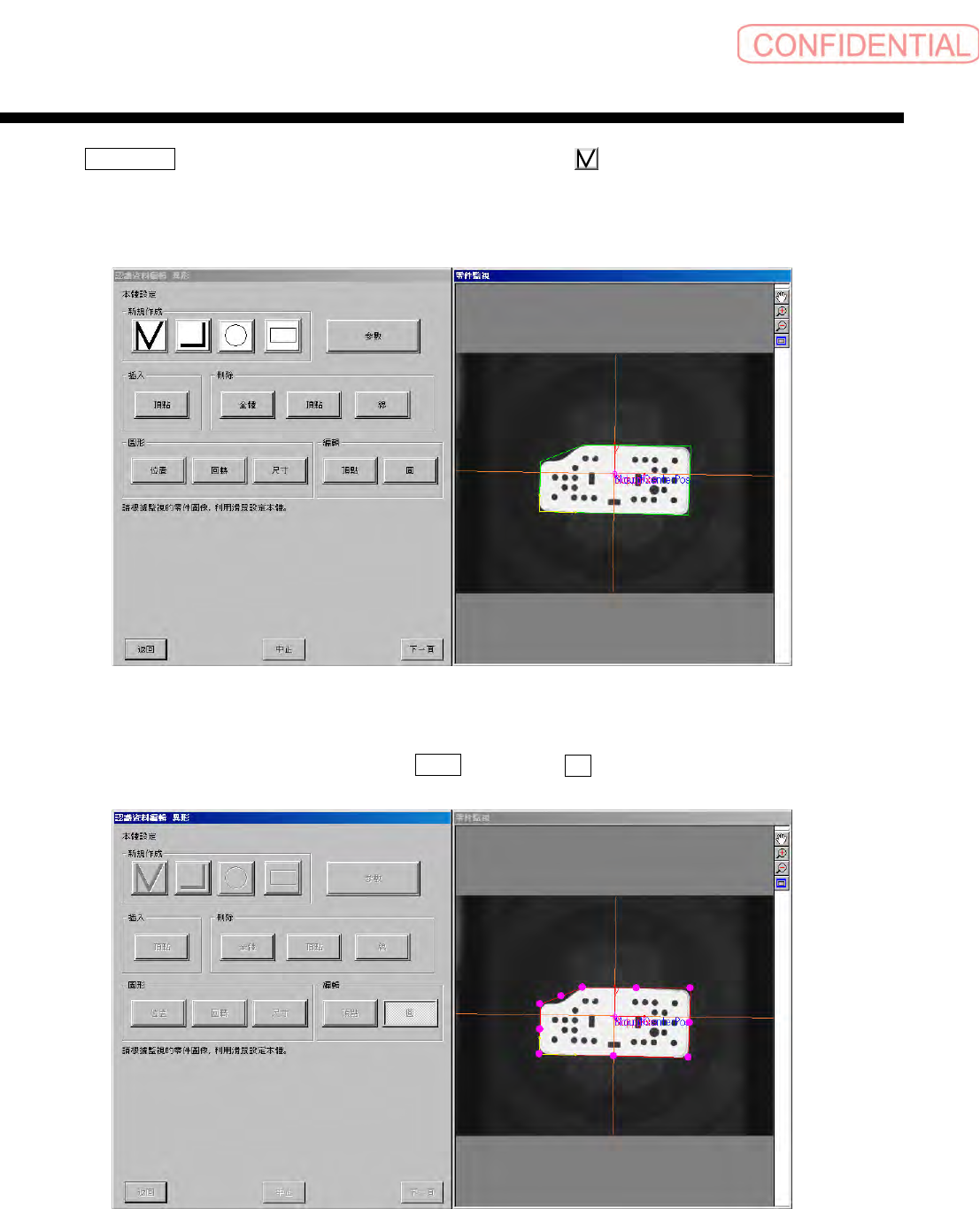 零件认识资料制作篇 零件认识资料制作篇 零件认识资料制作篇 零件认识资料制作篇 第 2 章 顺序 SI-F130/SI-F 209 2-57 会出现异型本体设定 画面。 首先,不要用缺省显 示的长方形的数据,点击零 件监视器上的长方形线,选 择 ( 红线 ) 。 图 1.7-7 缺省图的 删除 在被选择的状态下, 用 刪除 ( 删除 ) - 全體 ( 全体 ) ,删除线。 图 1.7- 8 缺省图的 删除