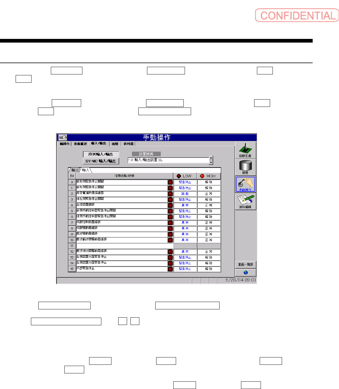 保养篇 保养篇 保养篇 保养篇 3. 输入以及输出信号 表 3-2 SI-F130 3.1 输入输出信号的确认 方法 输入输出信号 的确认方法 输入输出信号 的确认方法 输入输出信号 的确认方法 输入输出信号在 手動操作 ( 手动操作 ) 菜单→ 輸入 / 輸出 ( 输入 / 输出 ) 标签 → 輸入 ( 输入 ) 或者 輸出 ( 输出 ) 标签画面的状态下, 能够看见。 [ 操作步骤 ] 1. 顺次点击 手動操作 ( 手动操作 ) 菜…