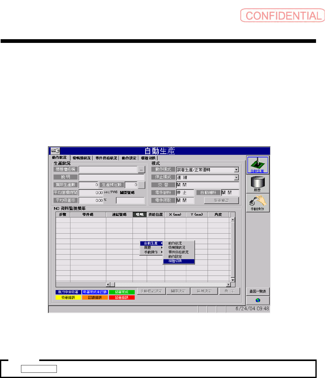 零件供給狀況 ( 零件供给状况 )、 動作設定 ( 动作设定 )、 機種切換 ( 机种切换 ),可以通过键