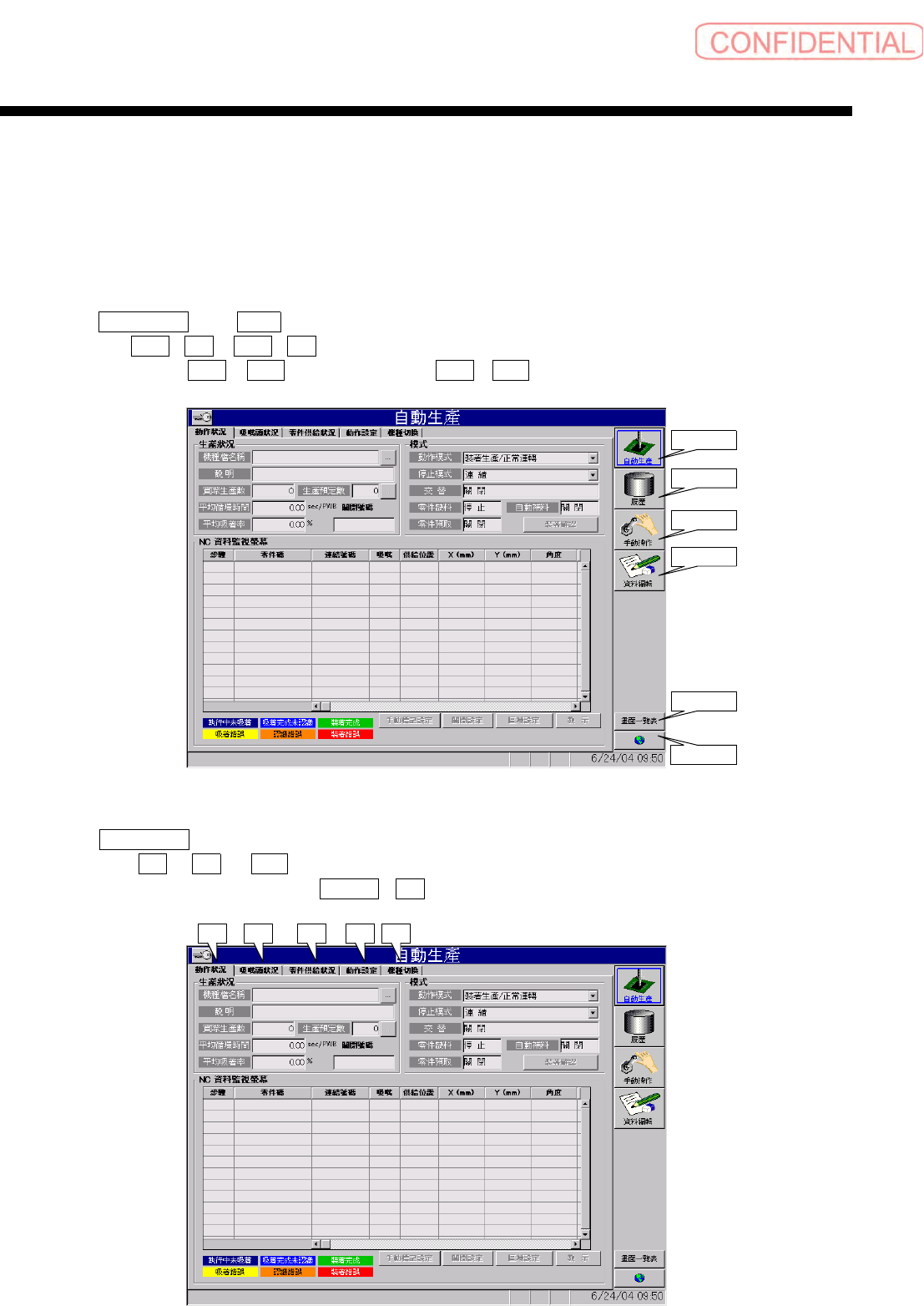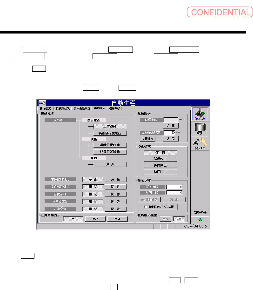 操作篇 操作篇 操作篇 操作篇 3. 操作画 面构成 SI-F130 3-7 (3) 本地菜单 关于 自動生產 ( 自动生产 ) 菜单的按钮 動作狀況 ( 动作状况 ) 、 吸嘴頭狀 況 ( 吸嘴头状况 ) 、 零件供給狀況 ( 零件供给状况 ) 、 動作設定 ( 动作设定 ) 、 機種切換 ( 机种切换 ) ,可 以通过键 盘进行操作。 · 项目用 TA B 键移动。 现在位置项目框和 按钮框变成蓝色。 各项目内的切换 ( ON/OF…