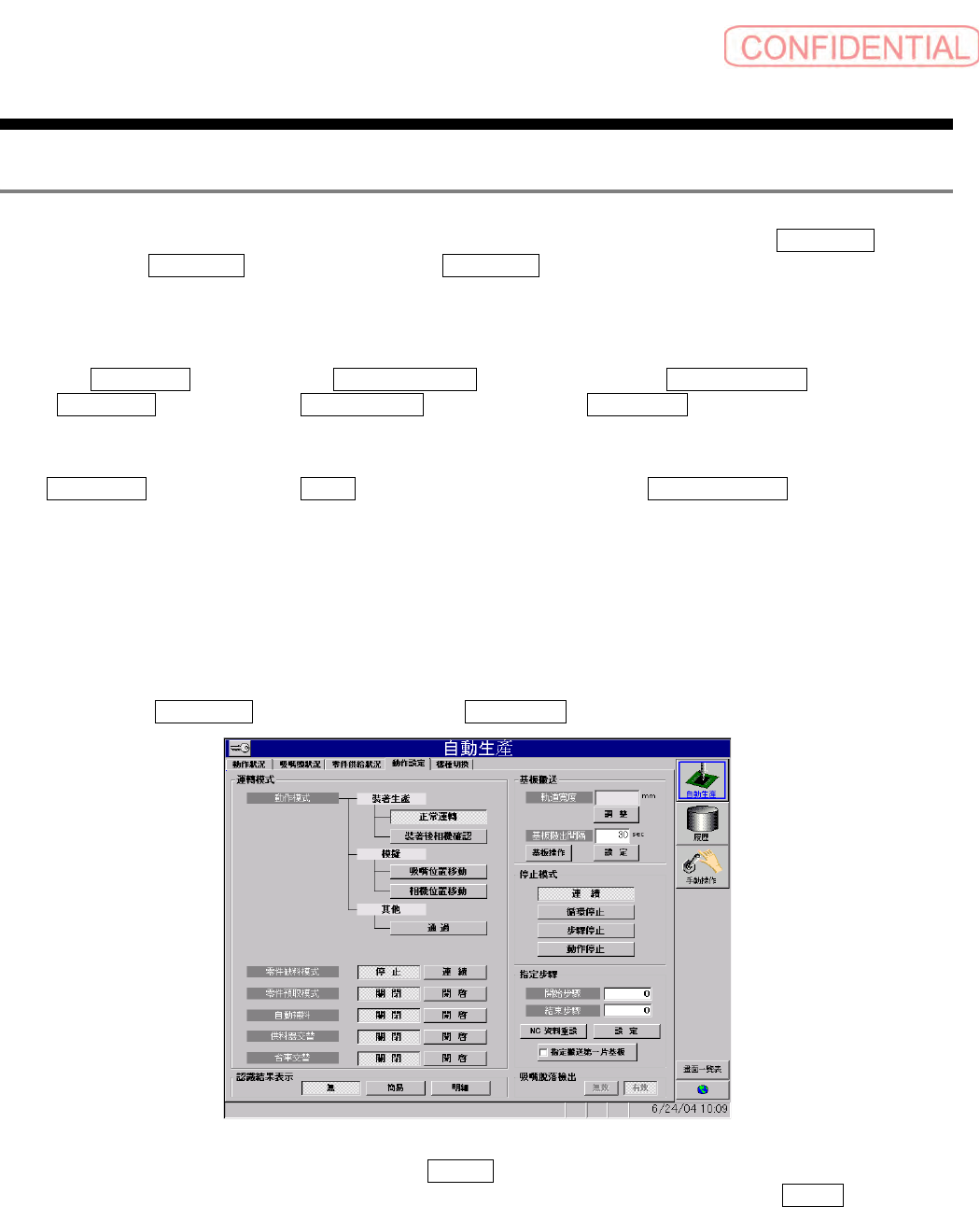 操作篇 操作篇 操作篇 操作篇 4. 自动生产 4-12 SI-F130 4.2.1 运转模式设定 运转模式设定 运转模式设定 运转模式设定 参照下面的 [ 画面说明 ] ,在自动生产点 击各种指令按钮选择必要的 功能。 [ 画面说明 ] 動作模式 ( 动作模式 ) 菜单如以下组成。 · 裝著生產‧正常運轉 ( 装着生产·正常 运转 ) 不执行基板相机确认 ,仅实际零件连续装着的自动 生产模式。在全部确认结束 后,请选择此菜 单。 · …