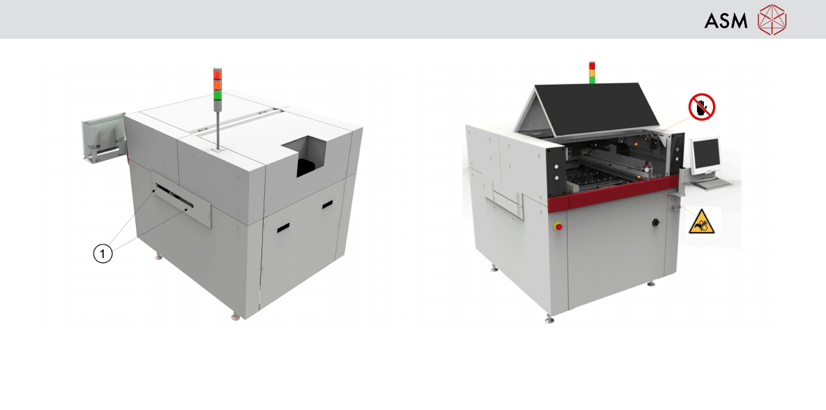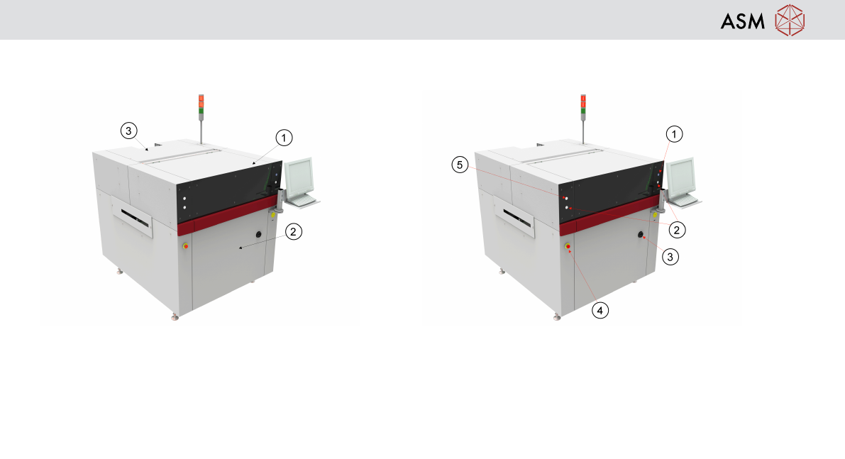 Operation - Safety 6 Safety Operation 1. Front protective hood 2. Front Cover 3. Rear Cover 1. System Power (blue) 2. Jog buttons (left and right) 3. Main Isolator switch 4. Emergency Stop button 5. Light