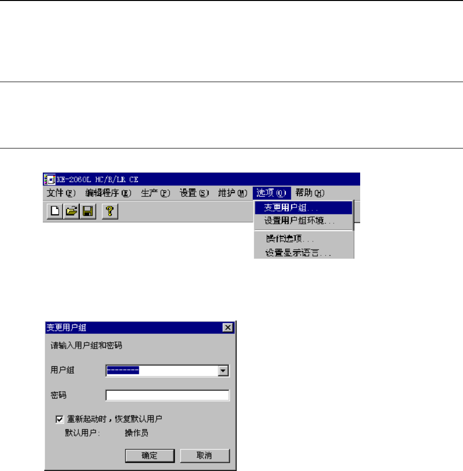 第 4 章 生产程序制作 Rev03 4-2 4-2 选项 选项菜单中集中了设定装置使用时的目 的、状况的各种功能。这一章节将对“用户组变更” 、 “用户组环境设定”以及“设置显示语言”( *1 )进行说明。 另外,有关“操作选项”的说明,请参照“5-2操作选项”。 *1英文版OS及英文版机器软件无法使用“设置显示语言功能”。 4-2-1 用户组(用户级别) KE2000系列为了防止对机器进行错误操作而引起误动作,通过对用户组进行设置,…