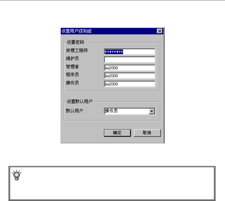 可改变变更用户组时输入的各密码,也可设置默认用户(参见4-2-1-1 用户组变更的“重启动