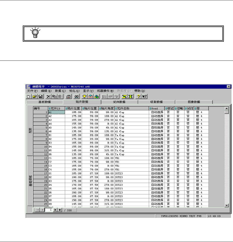 制作基板数据后,单击画面上方的“贴片数据”标签,显示贴片数据制作画面(下图为制作完