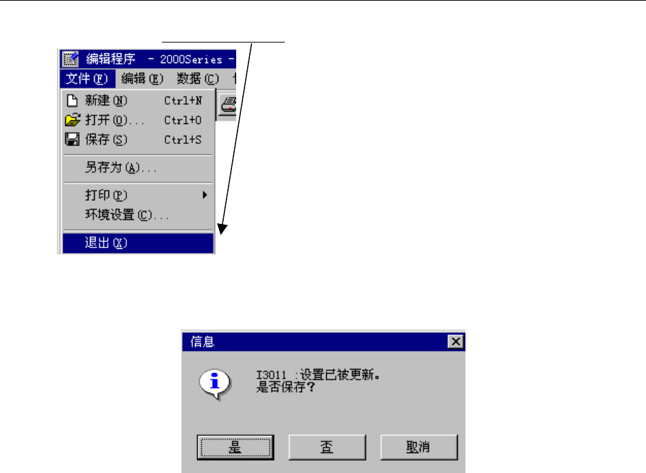 第 4 章 生产程序制作 Rev03 4-139 4-5-7 程序编辑的结束 从菜单栏中单击「文件」/「退出」 。 图 4-5- 49程序编辑的结束 如果程序中有所变更而尚未保存时,显示如下的确认。 图 4-5- 50结束时确认保存的对话框 ●“是” :进行保存。保存后结束程序编辑。 ●“否” :不进行保存而结束程序编辑。 ●“取消 ”:停止结束处理。