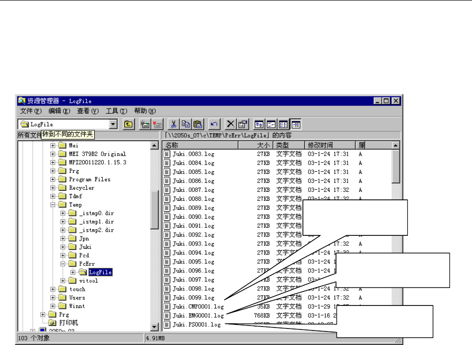 第 5 章 其它功能 Rev03 5-80 5-7-2-2 取得停机前的生产自动记录 本设备自动保存停机前的 100 张以下的基板生产数量记录文件。 ①保存记录 记录文件自动保存在 「 C:\T emp\PcErr\LogFile 」 文档中, 文件名为 「 Juki. 生产数量 .log 」 。 除 「 Juki. 生产数量 .log 」文件以外,还生成下列 3 个文件。 图 5-54 ②删除记录 切换生产程序后,以「 Juki.00…