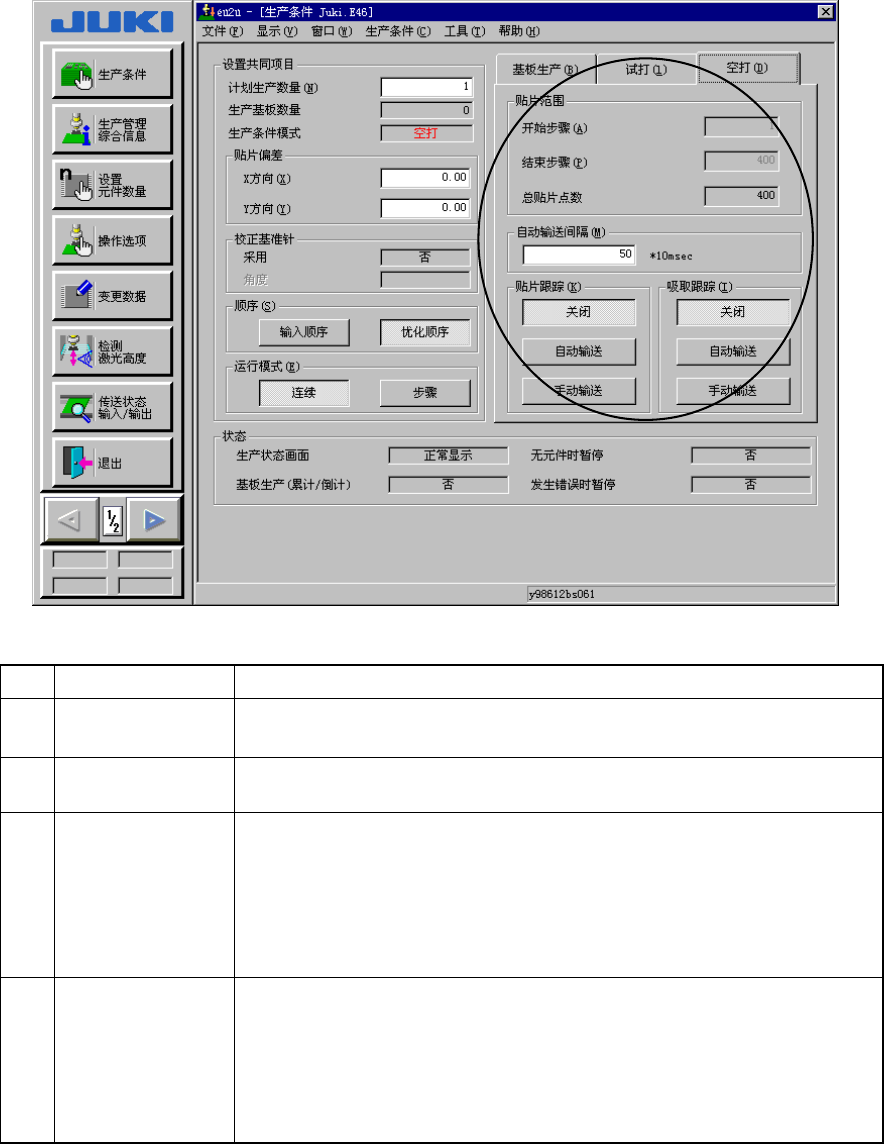 第 2 章 生产 Rev03 2-28 3) 空打 图 2-23 设定空打条件 No. 项目 内容 1 贴片范围 (步骤号) 需限定贴片范围时, 请输入开始步骤号和结束步骤 号。 在总贴 片点数 项中显示每 1 电路中的总贴片步骤号。仅在设定为输 入顺序时适用。 2 自 动 输送(传送) 间隔 自动传送跟踪时,请设定在停止位置上的停止时间。 以 10msec(0.01 秒)为“1”个单位。 3 摄象机贴片跟踪 空打基板后, 对是 否利用…