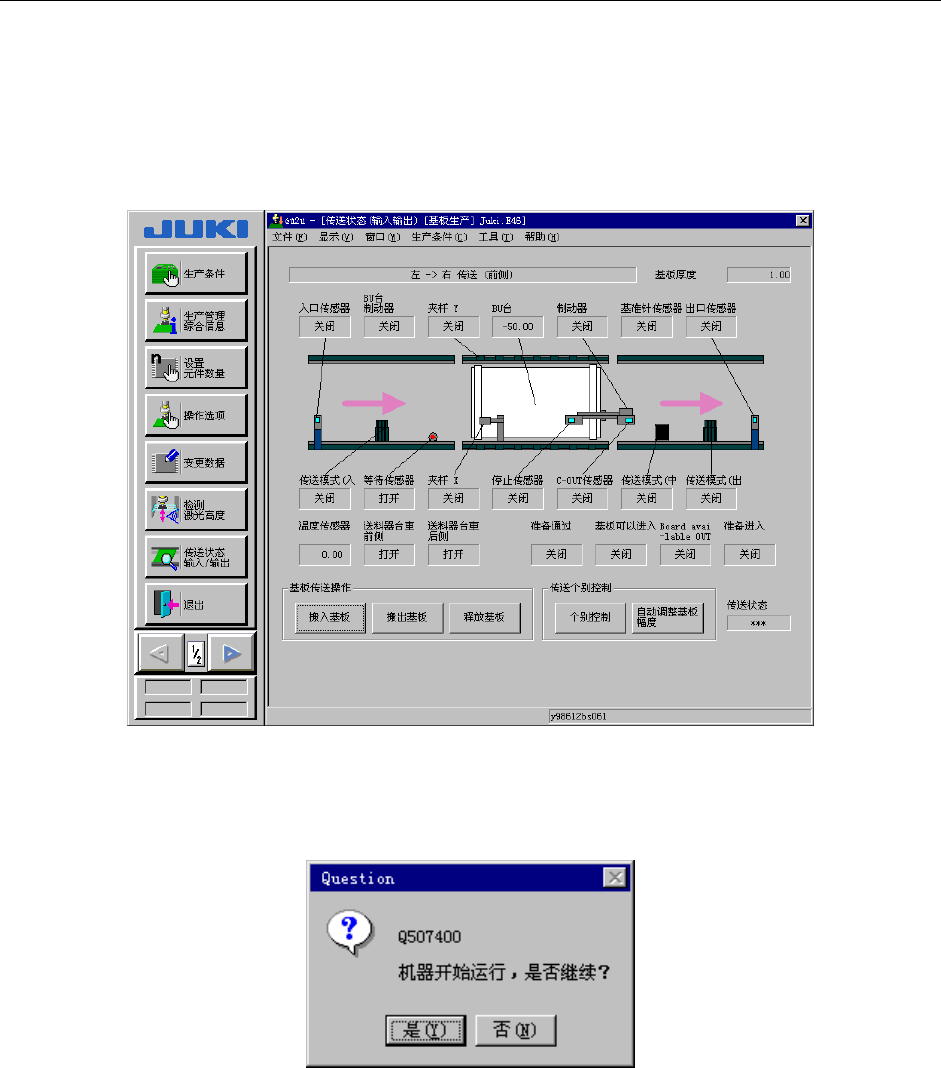 第 2 章 生产 Rev03 2-40 2-9-3 传送·I/O 状态 显示传送信息、I/O各种传感器信息(ON/OFF状态)。 此外,在下图的生产空运行画面中,可以执行基板搬入/搬出等传送运行。 从菜单栏中单击“窗口”/“传送·I/O状态”,显示如下的画面。 2-9-3-1 生产空运行中画面 图 2-34 传送·I/O 状态(生产空运行状态) ① 基板传送运行(基板搬入/基板搬出/基板固定解除) 按下各按钮,显示如下讯息。 图 2-3…