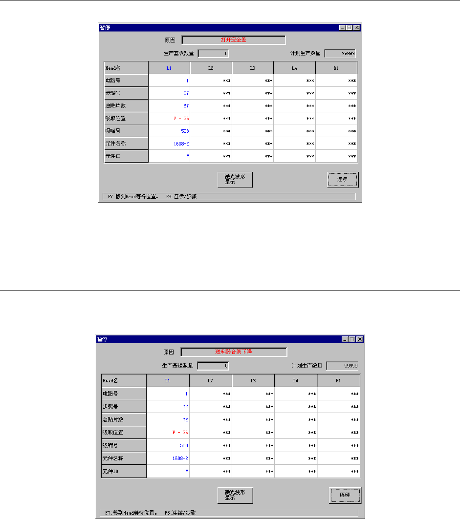 如果在生产动作中打开安全盖,则显示如下画面,并进入暂停状态。