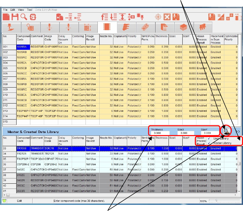 Menu: Program>ComponentData/FeederData/PackageData/PalletData/TrayData/NozzleData