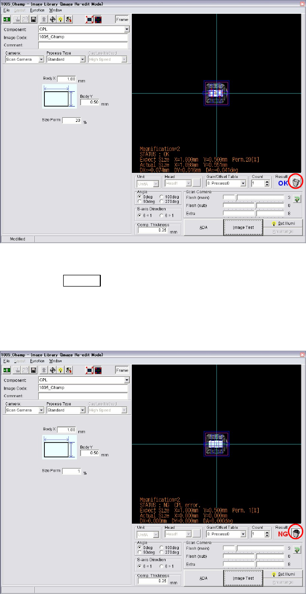 ⑧ If the picked up component is a defective, image test will fail as “NG”. In this case, click