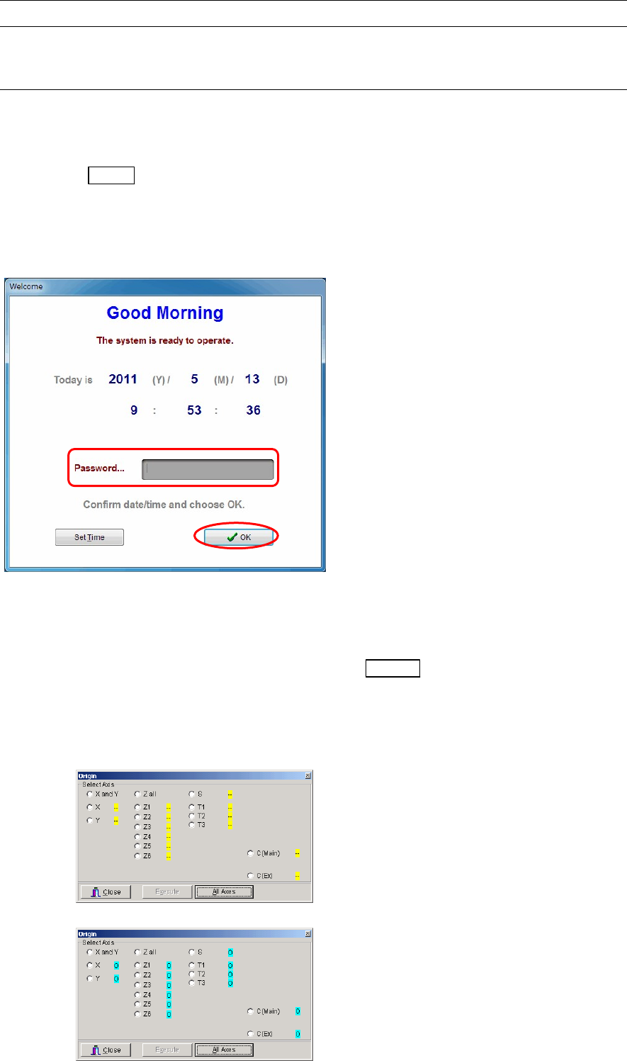 ⑥ Take the machine origin. Select Manual>Origin and click the <All Axes> button.
