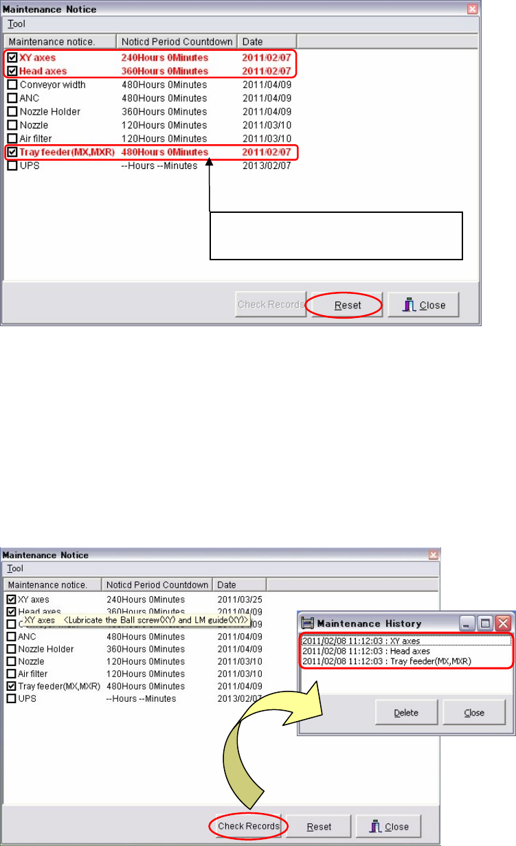 resetting the maintenance period. Click and check the red parts. Click the <Reset> button