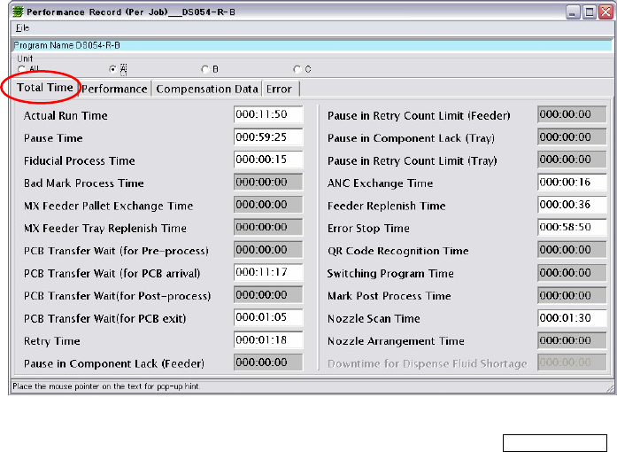 Chapter 12 Management Data 12-5 ■ Performance (Per Job); Produced PCB Count, Pause Count, Fiducial Pr ocess Count, Fiducial Mis-recognition Count, Fiducial Coordinates Adjust Count, Bad Mark Process Count, Bad Mark Mis-R…
