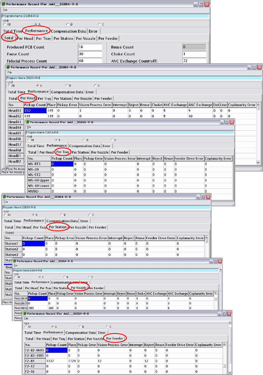Count (on), Pickup Error Count in Comp Exhaustion, Feeder Link Count, PCB Skip Count,