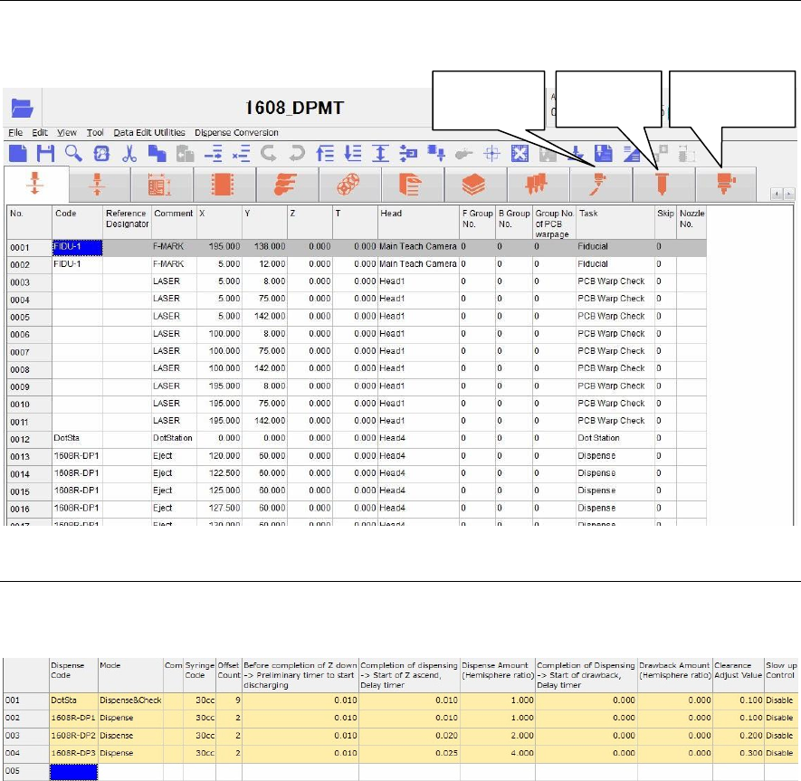 Chapter 16 Dispenser 16-6 16-1-3-1 Dispenser related data This dispense related data includes dispense data, syringe data, and dispense nozzle data as described below. 16-1-3-2 Dispense data The dispense amount is set wi…