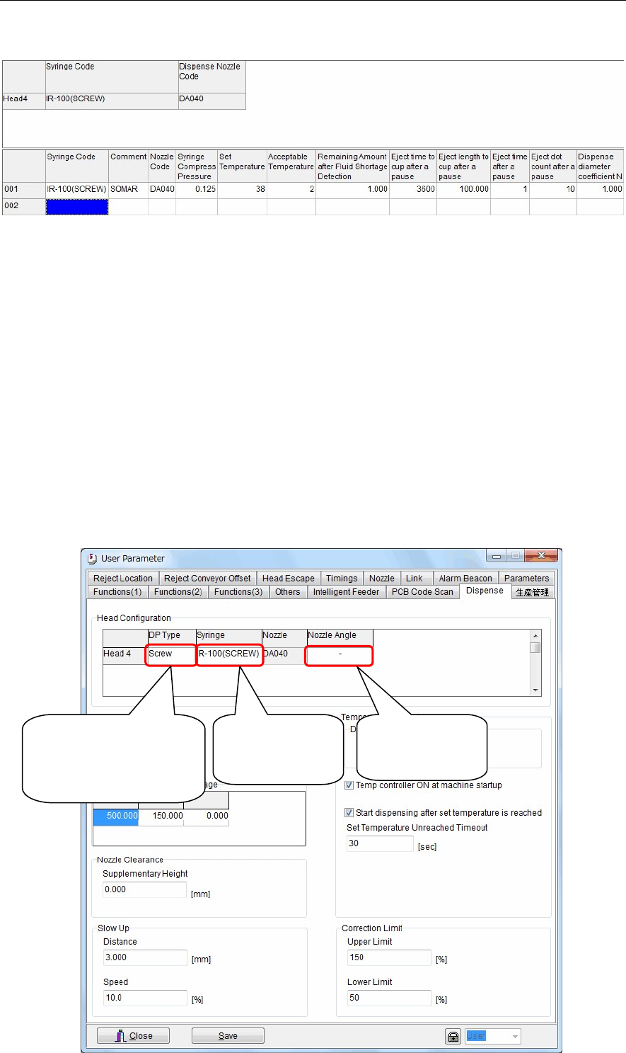 Chapter 16 Dispenser 16-9 16-1-3-3 Syringe data This syringe data contains data related to the dispense material. Menu: Syringe Data Window: Syringe Code (Upper) Indicates which syringes (syr inge codes) are mounted at t…