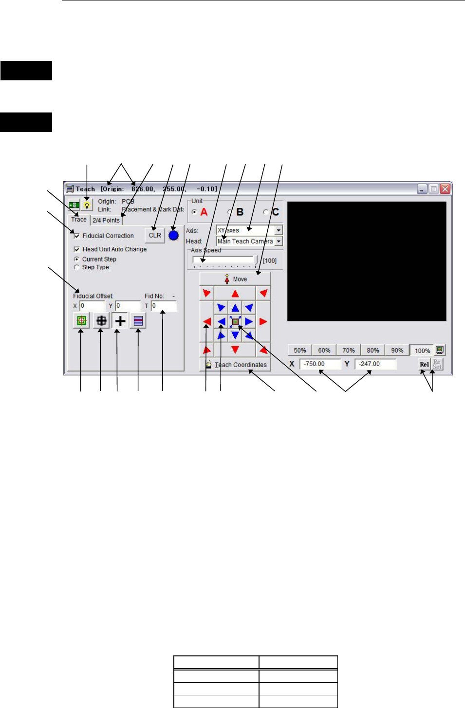 Action: The following shows how to teach X, Y coordinates on a PCB using the main teach camera