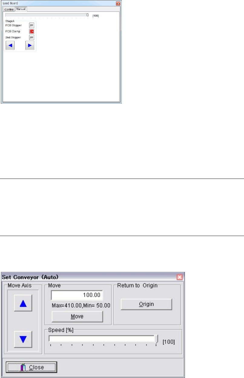 ① Click <OFF> buttons to move PCB Stopper up and set PCB Clamp. The buttons will be