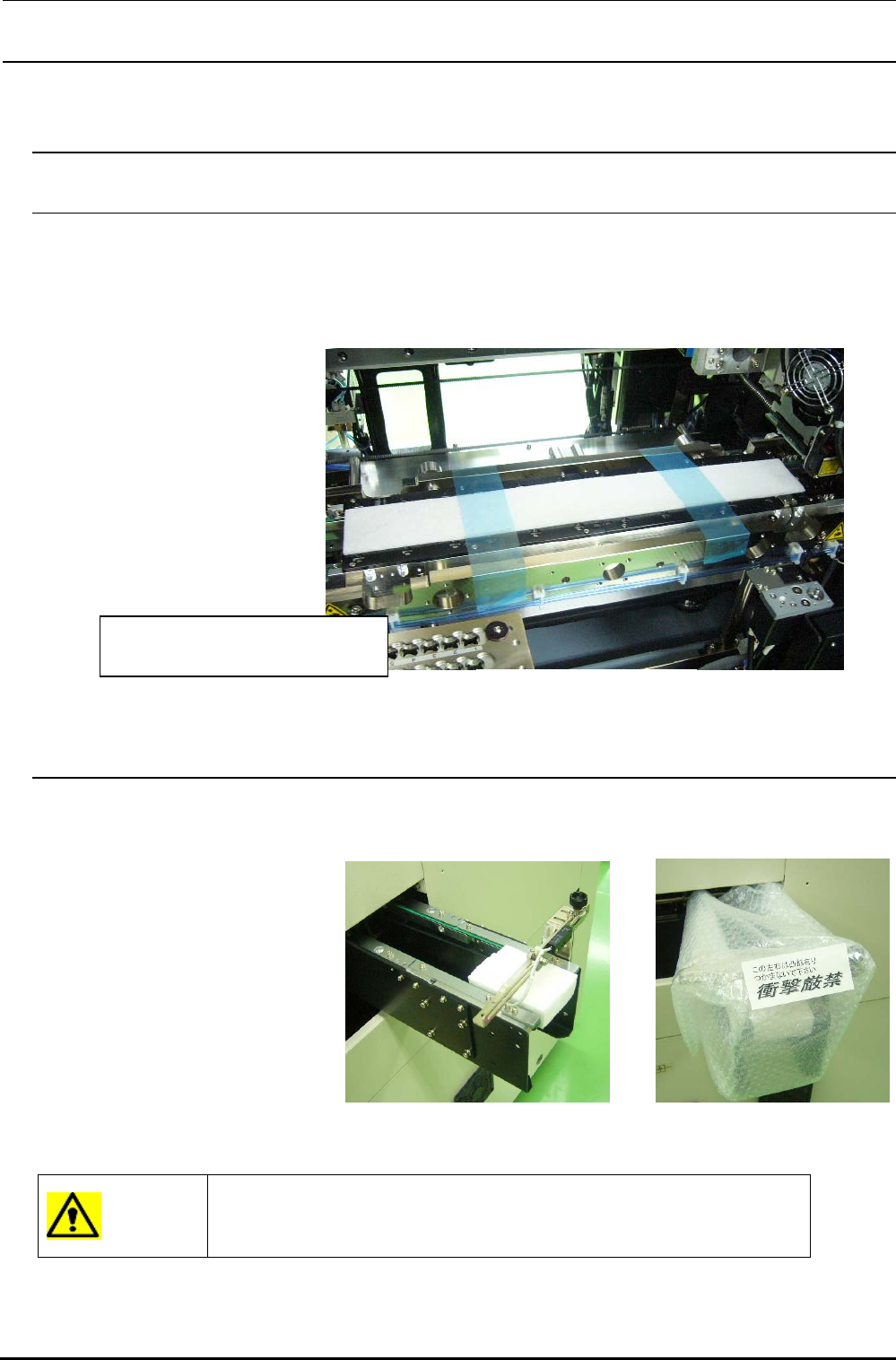 Rev1.00 包装要领书 6 3-2. 包装方法 3-2-1. 中央部分 ① 把传送轨道宽度调整到基板宽度(大约 60mm )程度,把轨板中央部,然后固定。 ② 用纤维丝胶带固定。( 2 处) 3-2-2. 左右两端部 ① 把轨板放到从主机突出的部分。 ② 如下图所示用气泡包装材包好。 注意 • 请注意不能在轨道板(黑色部分)上施 加任何负荷。 • 如果轨道板弄弯曲的话,机器就不能使 用了。 以胶带固定,防止支承台上下产 生 松动。 …