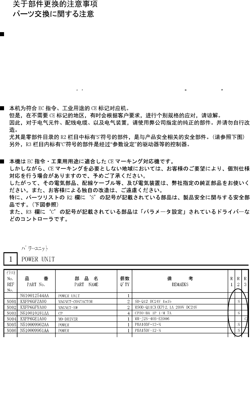 Particularly, the parts marked with 'S' in the R2 column in the list are safety parts related to