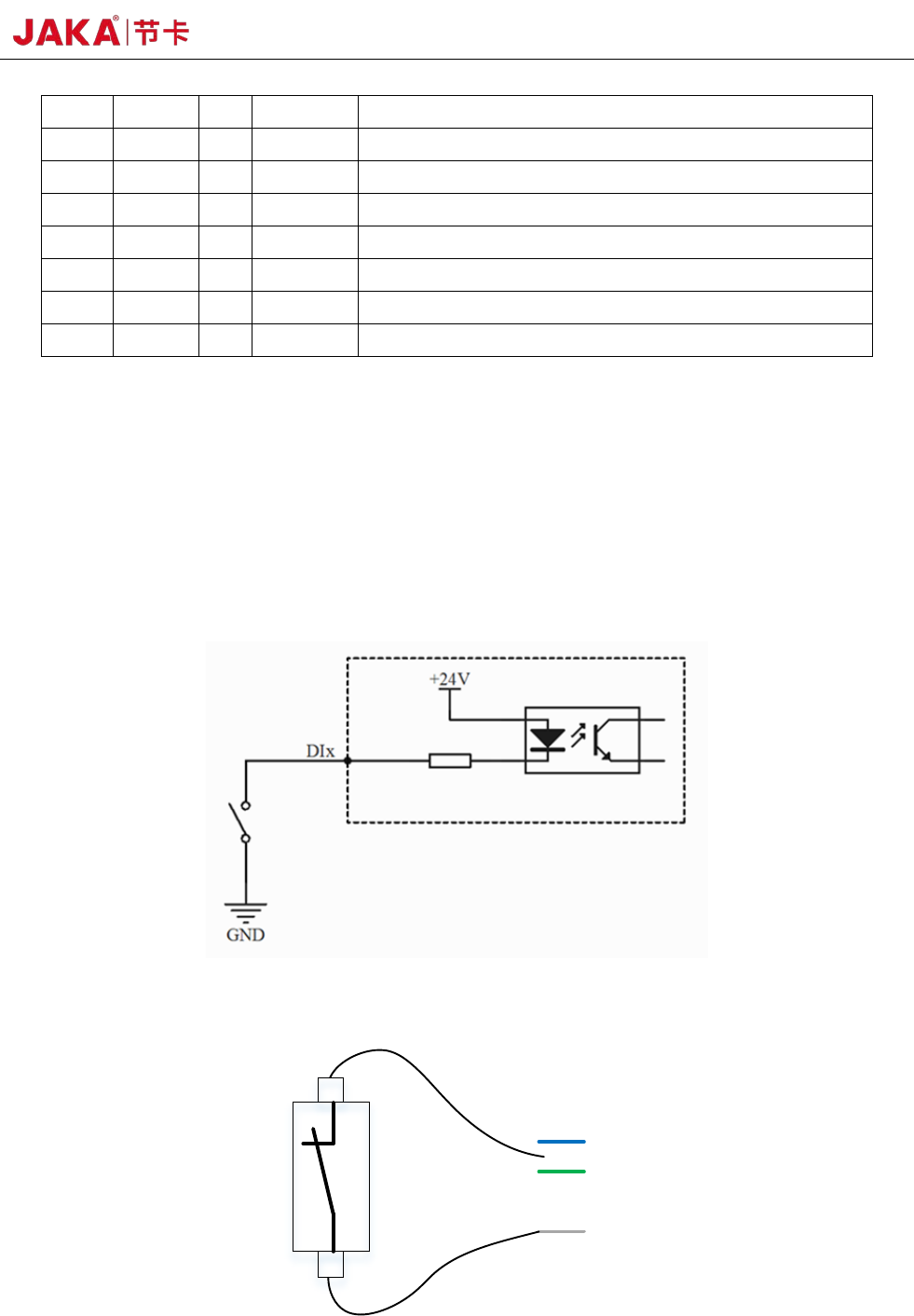 30 JAKA Zu 3 v1. 1 图 4-1 6 重载连接器接口定 义图 警告: 1. 禁止在机器人未 完全断电时,断开 机器人电缆。 2. 禁止延长或改装原 线缆。 4.5 工具端输入输出接口 工具端输入输出接口简 称 TI O ( T ool Inpu t and Out put ) 布置在 机器 人工具法兰侧面, 包括 两个数字量 输 入,两个数字量输出与 一个模拟量输 入,其接口定 义请参考 4.5 .1 章节: 如果需要选…