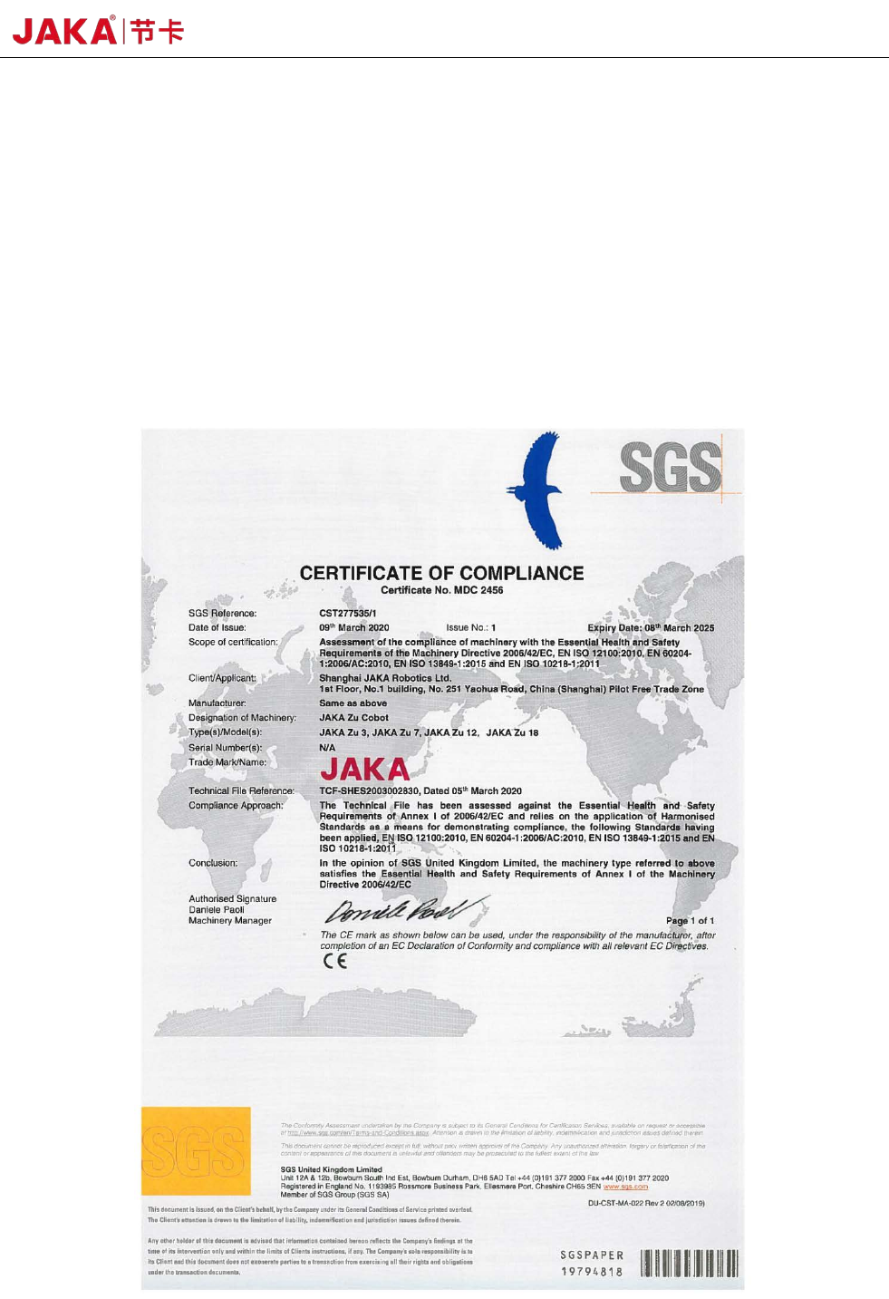42 JAKA Zu 3 v1. 1 《欧盟机械指令 2006/42/ EC 》 《 EN ISO 1384 9 - 1:2015 机械安全 控制系统 中与安全相关的 部分 第 1 部分 : 设计的一般原则》 图 6- 4 功能安全认证证书 《欧盟机械指令 2006/42/ EC 》
