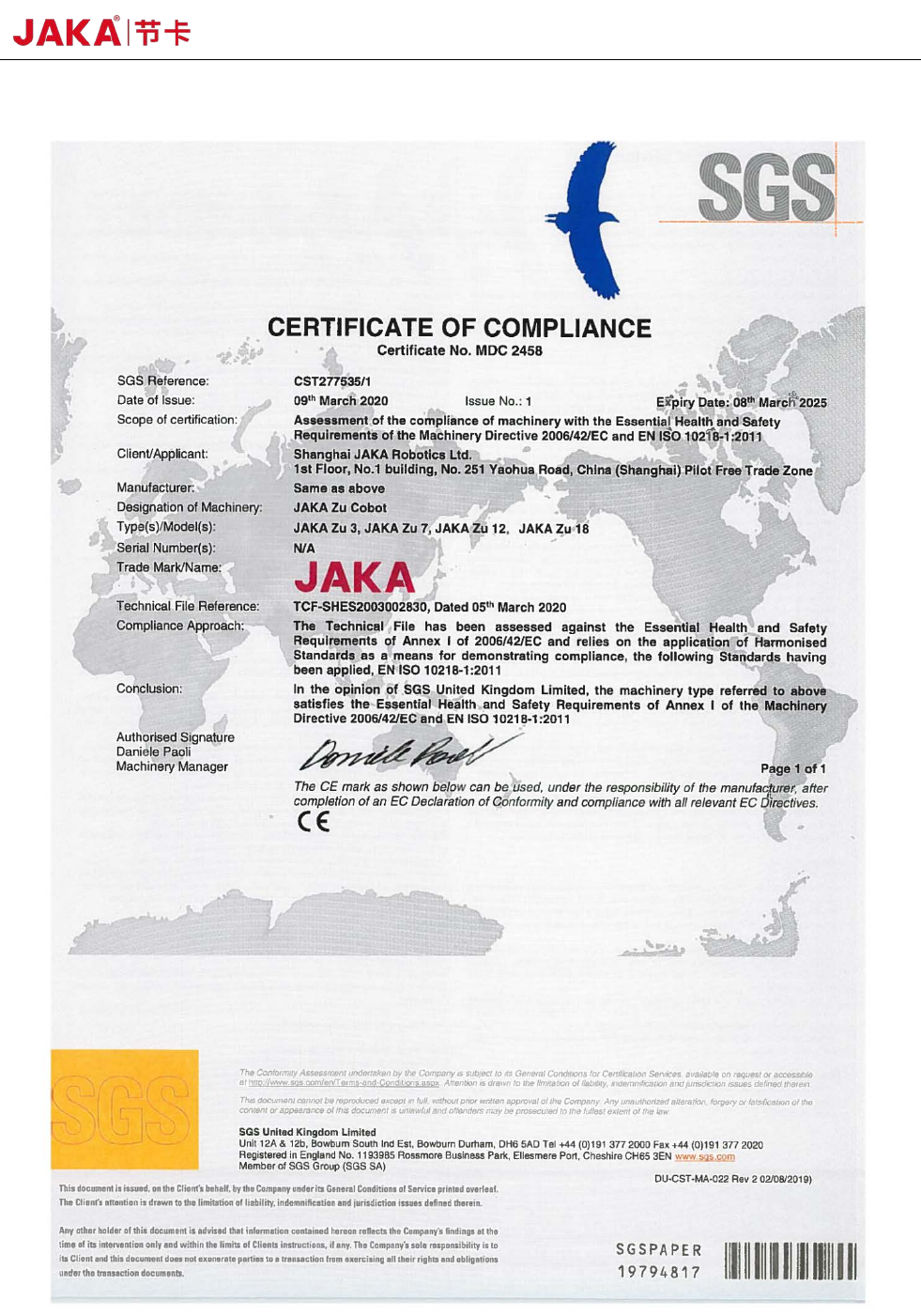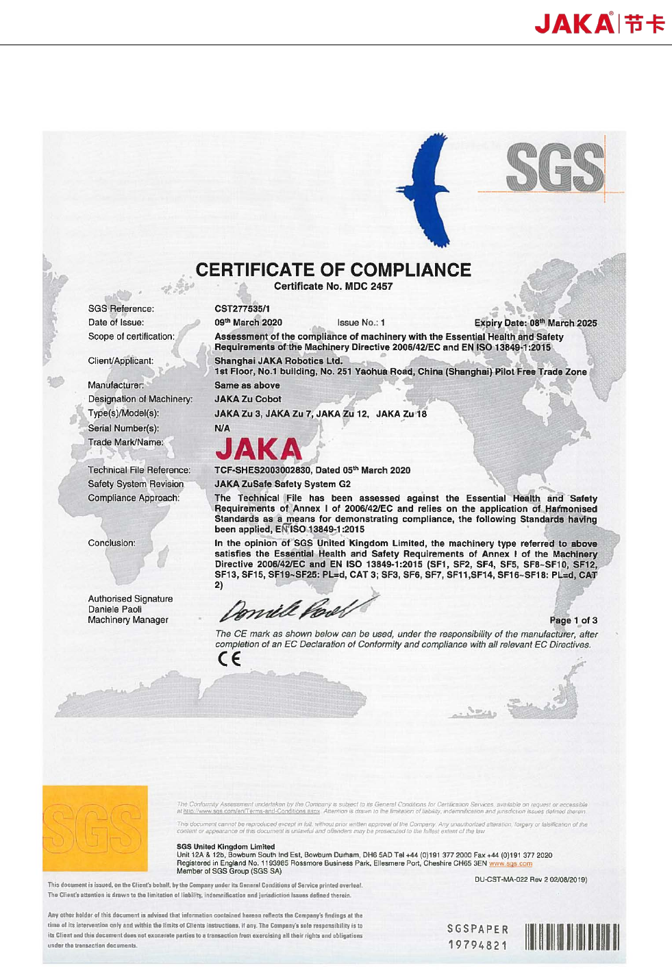 JAKA Zu 3 v1. 1 43 《 EN ISO 1021 8 - 1:201 1 机器人和机器人 装置 工业机 器人安全要求 第 1 部分 : 机器人》 图 6- 5 功能安全认证证书