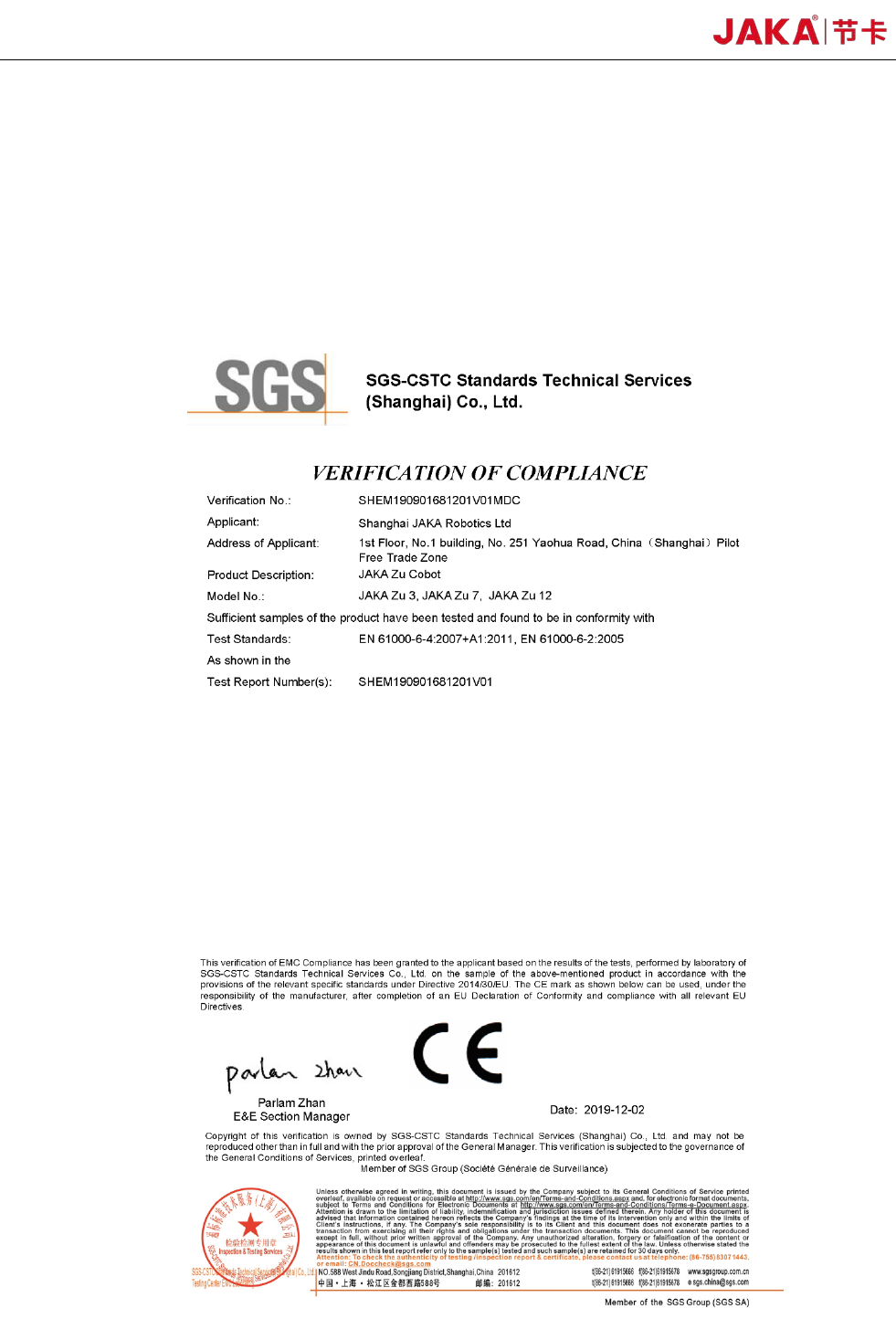 本公司产品 JAKA Zu 3 机器人,通过欧盟 CE EMC 指令,符合 CE EMC 指令的相关要求,测试标准和认