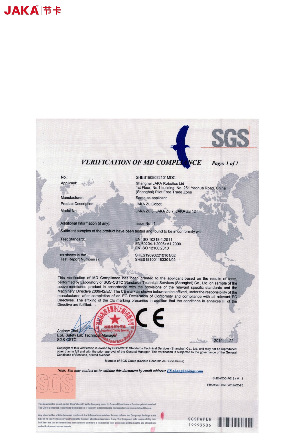 46 JAKA Zu 3 v1. 1 6.6 RoHS 认证 本公司产品 J AKA Zu 3 机器人,通过欧盟 R oHS 2. 0(201 1/ 65/EU) 及修订指令 ( EU)2015/ 863 ,符合 欧盟 RoHS 2.0(2 01 1/ 65/EU) 及修订指令 (E U)2015/8 63 的相关要求,测试标准和认 证证书如下: 图 6- 8 RoHS 认证证书