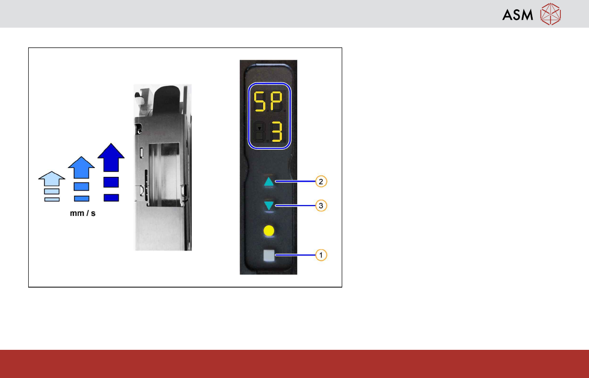 Operating the Feeder Module - Setting the Transport Speed 17 www.asm-smt.com 1.13 Setting the Transport Speed The transport speeds "slow"(1), "middle"(2) and "fast" (3, default) are availabl…
