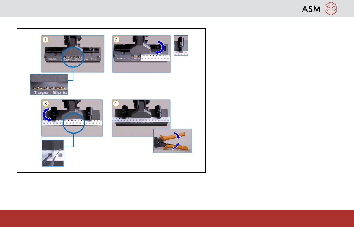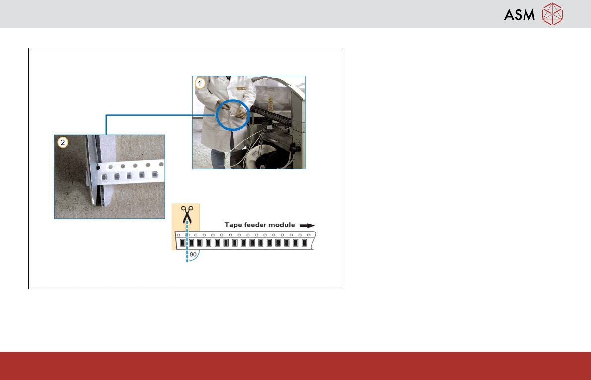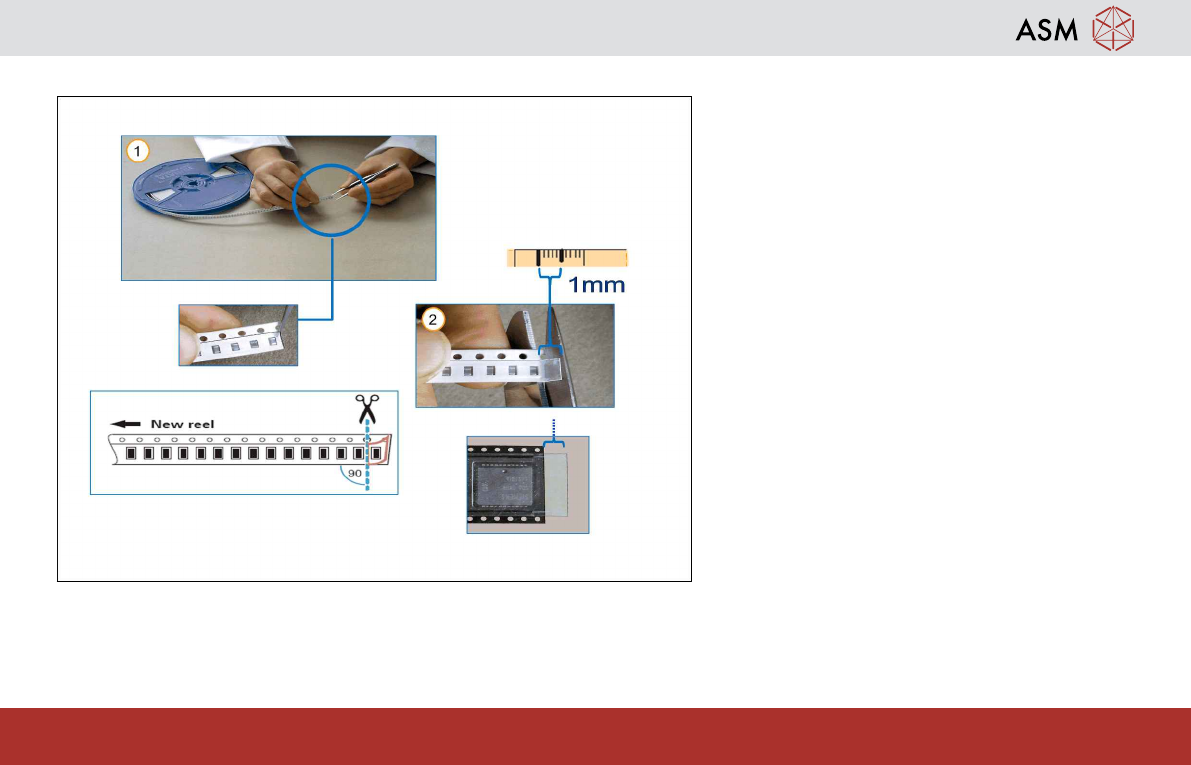 Splicing - Preparing the New Tape 28 www.asm-smt.com 2.3 Preparing the New Tape 1. Peel off the foil (about the width of a com- ponent pocket) towards the back. 2. Cut the tape exactly between two pockets in the middle o…