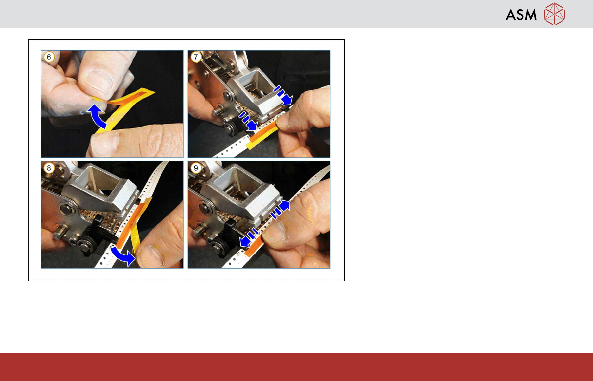Splicing - Splicing with the Multi-frame Tape Splice Gripper 34 www.asm-smt.com 1. Remove half of the protector strip. Attention : Do not touch the sticky surface! 2. Lay the adhesive strip on top of the com- ponent tape…