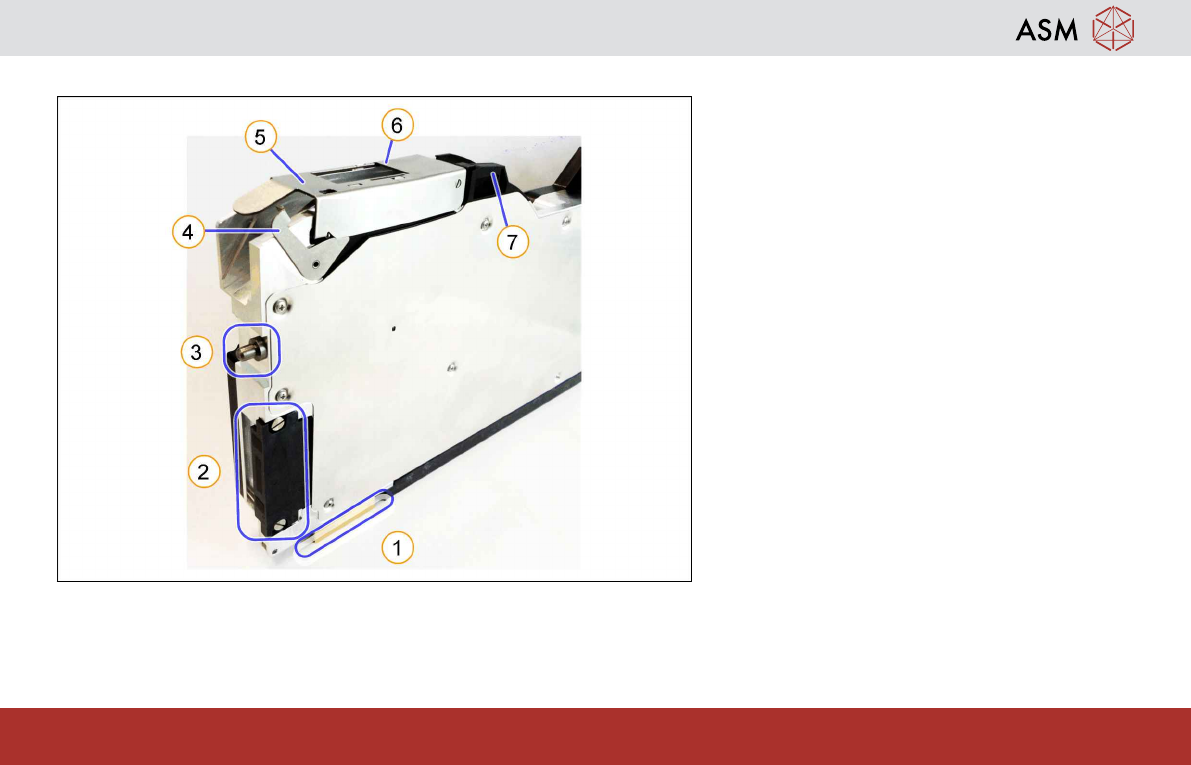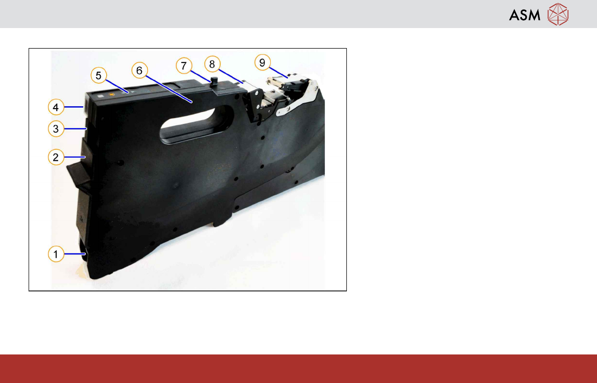 Operating the Feeder Module - Rear side 7 www.asm-smt.com 1.3 Rear side 1. Tape duct with spring 2. Foil disposal flap 3. Removal handle 4. Status display 5. Operator panel 6. Handle 7. Rear centering pin 8. Foil removal…