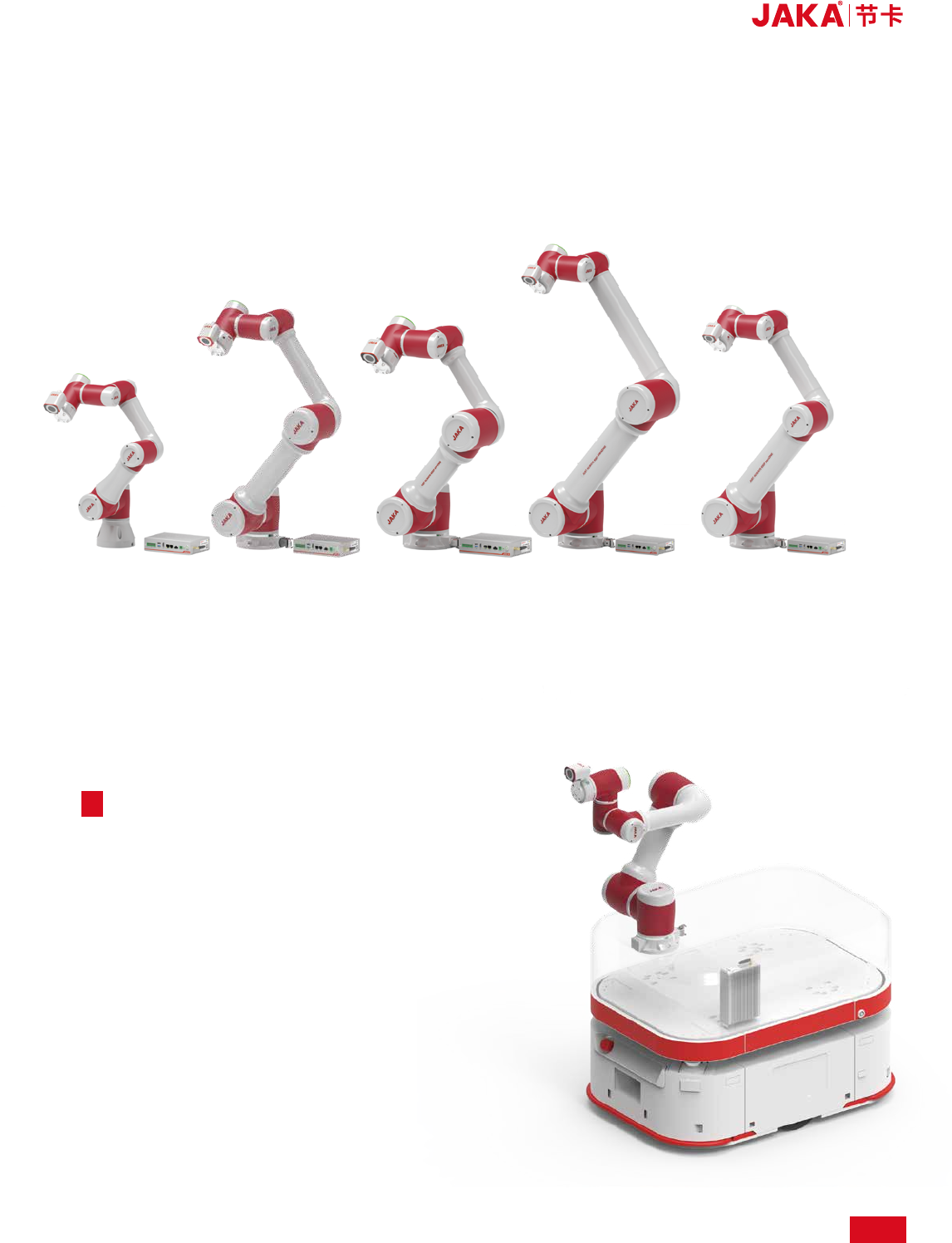 19 JAK A All-in-one 共融系列协作机器人采用 S 3 (Smart , Simple , Small) 的产品设计原则,极致创新,融合了无线示 教、 图形化编程、 视觉安全防护等机器人技术 , 革新了人与 机器人的交互方式 , 提升了人机协作交互的安全性 , 大大降 低了机器人的使用门槛。 同时 , 节卡新一代共融协作机器人 已深度融合视觉 , 保障机械臂、 人、 作业环境三者之间自然 交互、 自主适应 , 显著拓宽了…