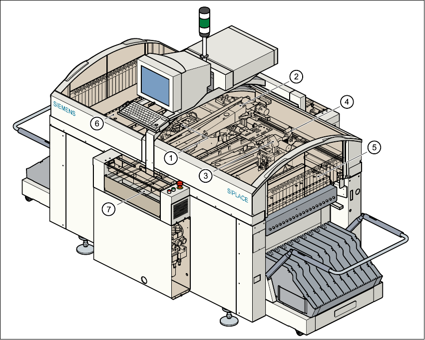 SIPLACE Manuale software SR.503.xx 2 Presentazione e concetti fondamentali Edizione 12/2001 IT 2.2 Visione d’insieme 17 2 Fig. 2.2 - 2 Schema riassuntivo macchina per montaggio automatico (esempio S25-HM) Legenda sulla f…