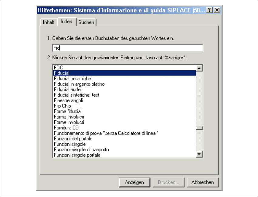 Si aprirà la finestra Hilfethemen (Argomenti Guida) con le schede "Index" (Indice) e "Suchen"