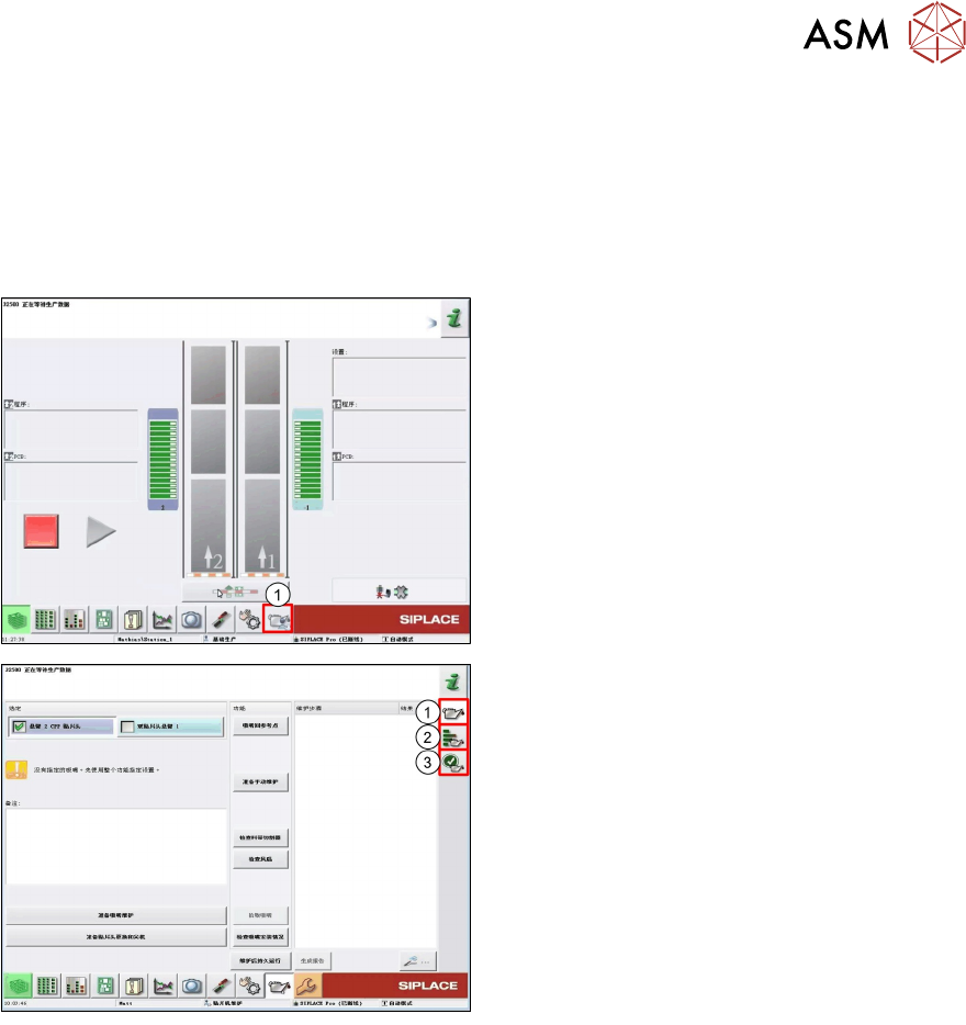 9 贴片机软件概览 9.6 贴片机软件选项概览 158 技术培训 FSE SIPLACE TX系列 08/2018 配置吸嘴扫描选项示例。 1. 吸嘴扫描选项卡 2. 吸嘴扫描类型(级别) 3. 吸嘴扫描出错后,机器自我修复动作 4. 吸嘴扫描出错后的措施(修复措施无法解 决问题) 可根据吸嘴类型、工厂环境、生产转换频率等 因素进行设置。 9.6 贴片机软件选项概览 1. 贴片机软件选项主菜单 2. 配置菜单 3. 贴片工艺(贴片过程中…