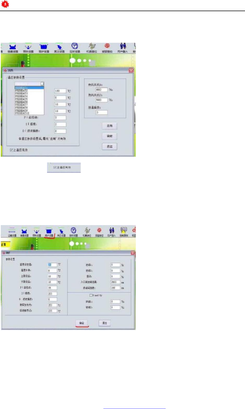 设置预热温度,设置预热温度报警值,预热温区数,热风风机及控温路数等。
