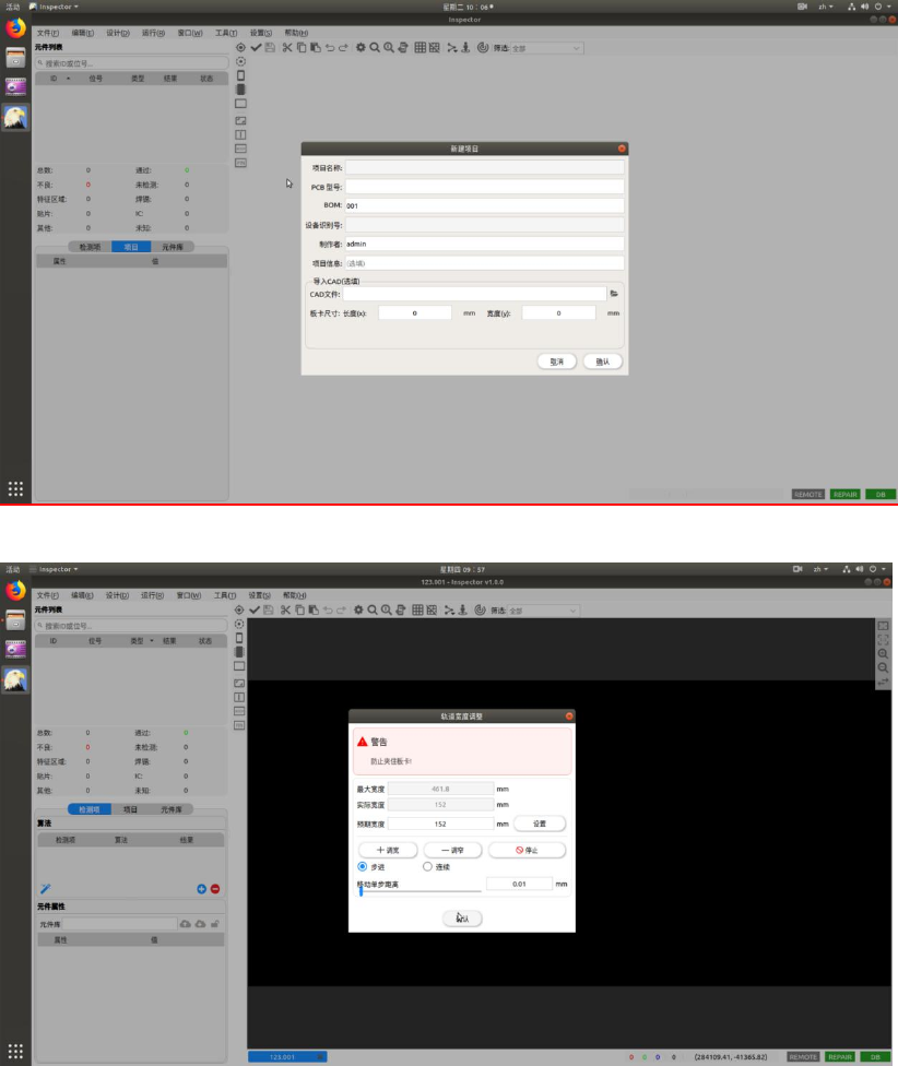 新建板式流程 打开软件 -新建程序-基板 信息设置- 扫描整版图 片-制作 mark-导入 CAD- 编辑器件-优 化 FOV 路径-调试 误报-正常测试 。 1. 进入 软件界面 后点击 文件 - 新 建项目 - 输入机 种名称和 基板 长度和宽 度,完毕 后点击 确认。 1.调整轨道宽 度,预期宽度 内输入 PCB 板 宽度(正 常比实际测量 宽度+0.3/0.5mm ) 点击设置, 待调宽完毕后 可使用实际产 品验证。 2.如需轨…
