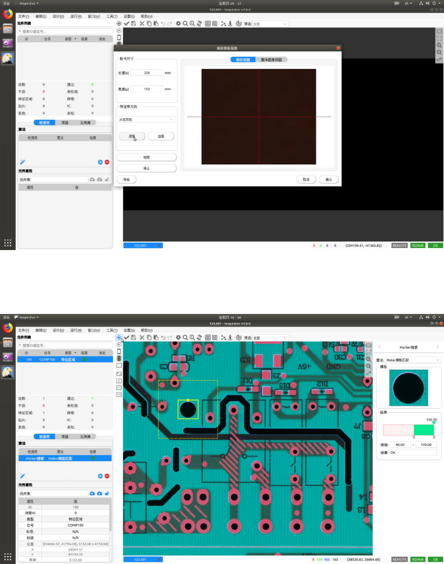 取一片 OK 品放到机器进板口,点击进板,待基板达到停板位置后点击拍照,相机