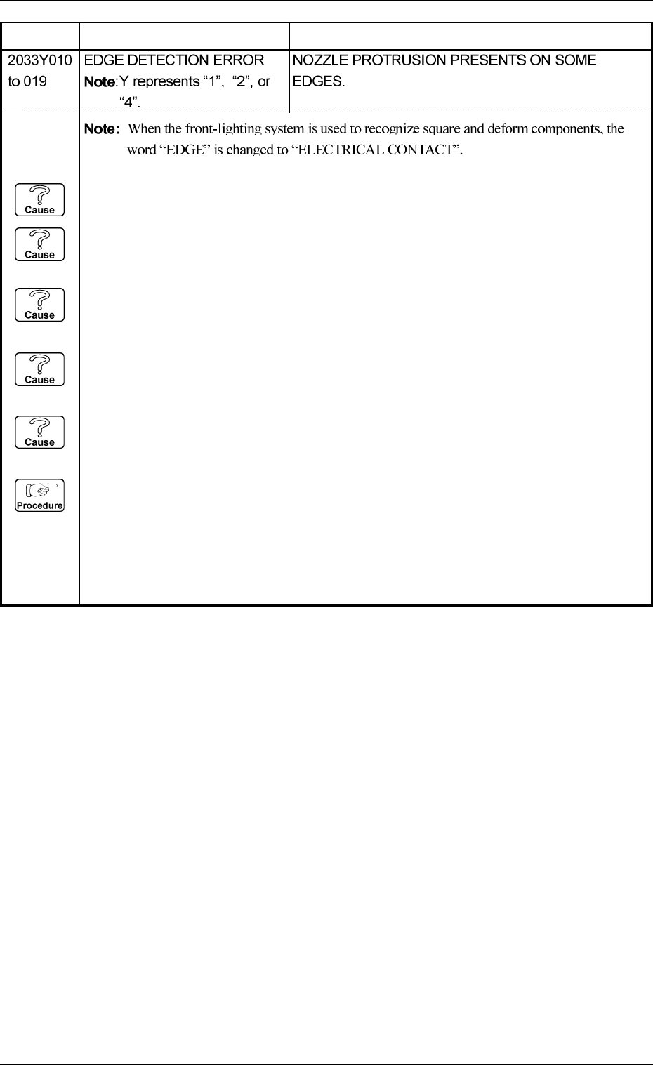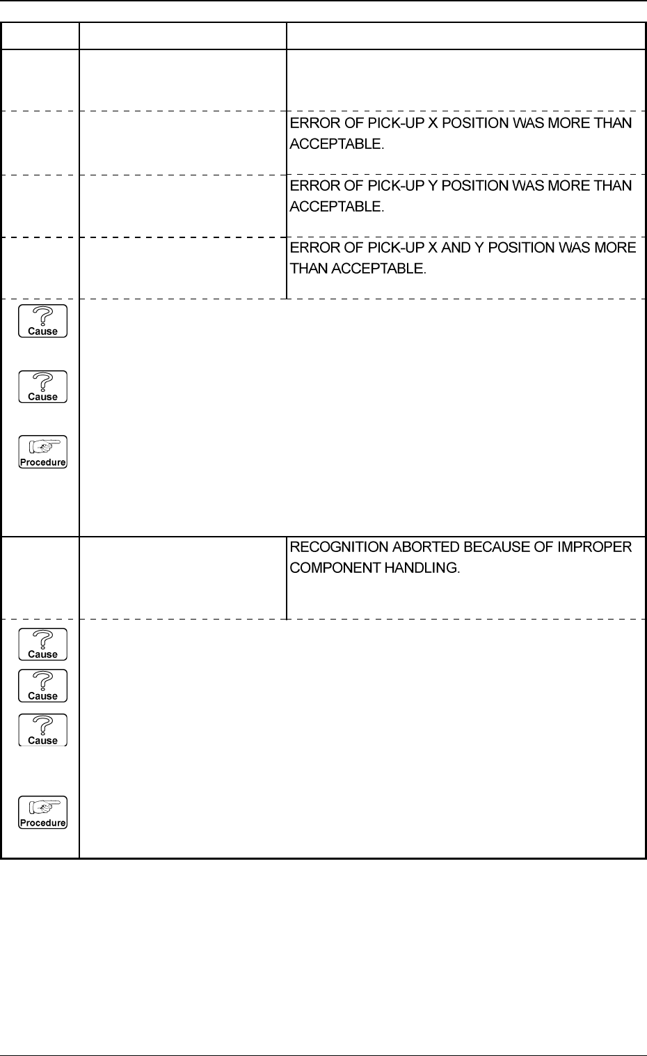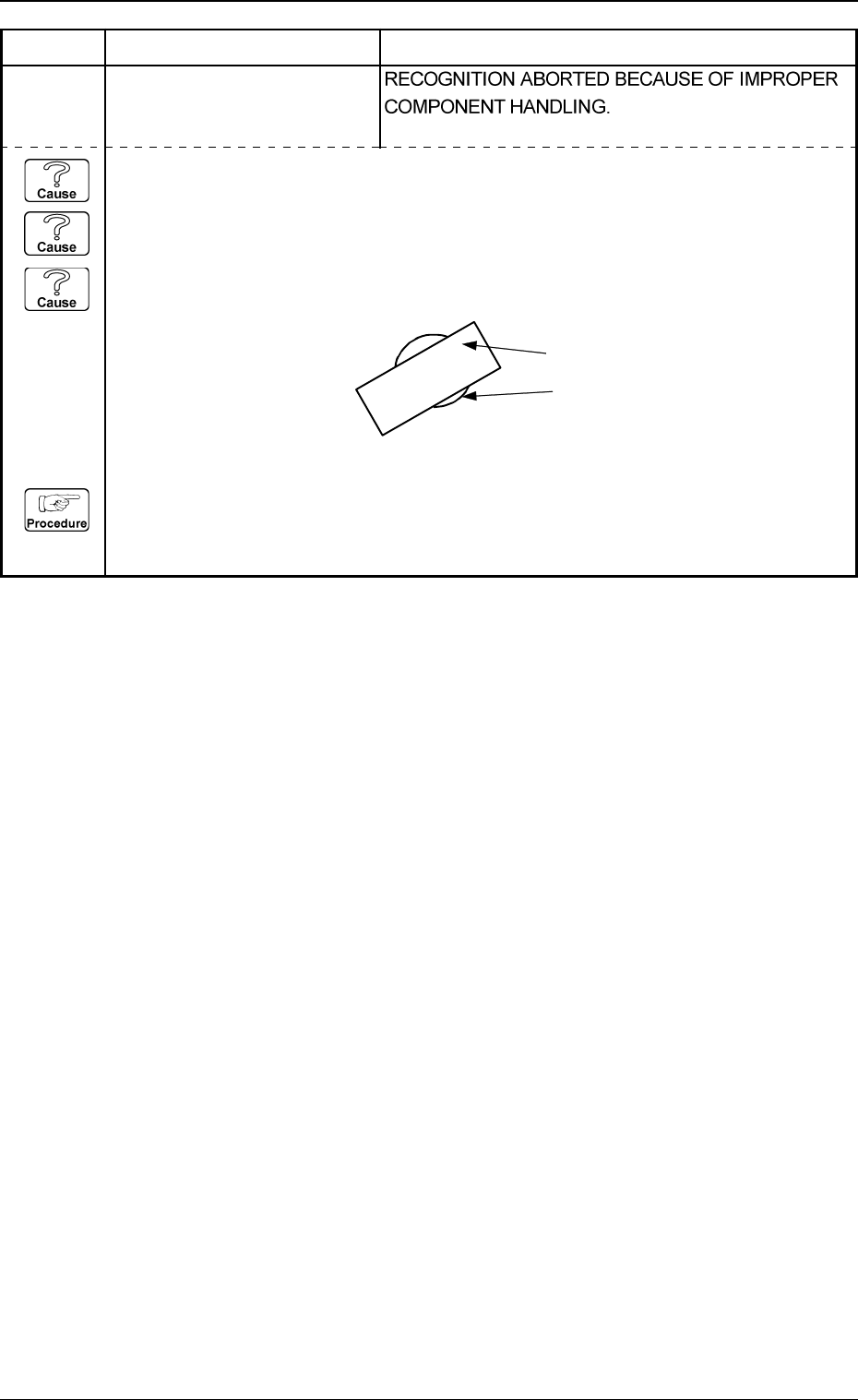 (Cause 1) An improper vacuum nozzle is selected for the components or vice versa. (Cause 2) The component is bent due to weak vacuum suction force. (Cause 3) When a component is picked up, the pick-up positions (X and Y)…