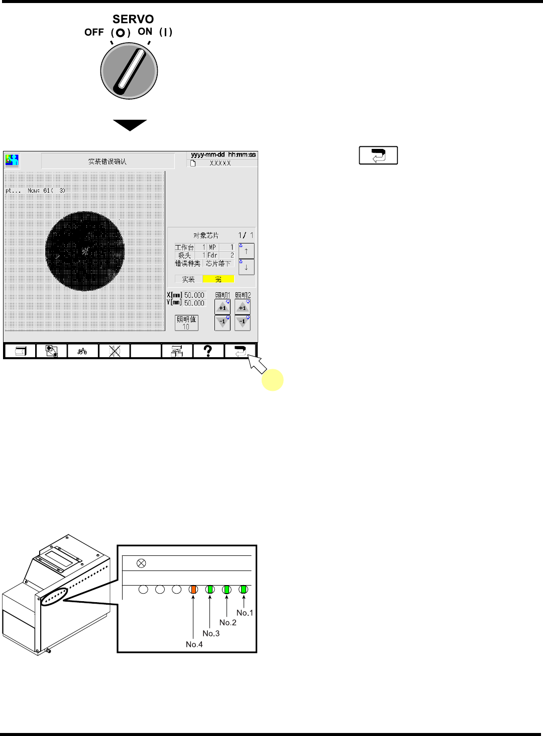 CM602-L 维修手册 3.2 检查和对策 Pa ge 3- 54 4. 确认吸嘴、供料器等是否有问题。 ∗ 看对象芯片的信息,确 认该当吸嘴和 供料器等 是否有异常。 如果吸嘴即将堵塞时, 请清扫。 5. 将伺服开关置于 ON ( I ) 。 6. 按功能键的 。 • 返回到主菜单画面。 3.2.9 3D 传感器异常 请卸下整体交换台车, 并确认 3D 传感器的 LED 。 ∗ 3D 传感器的 LED 不进行下列动作时 , 则表示 …