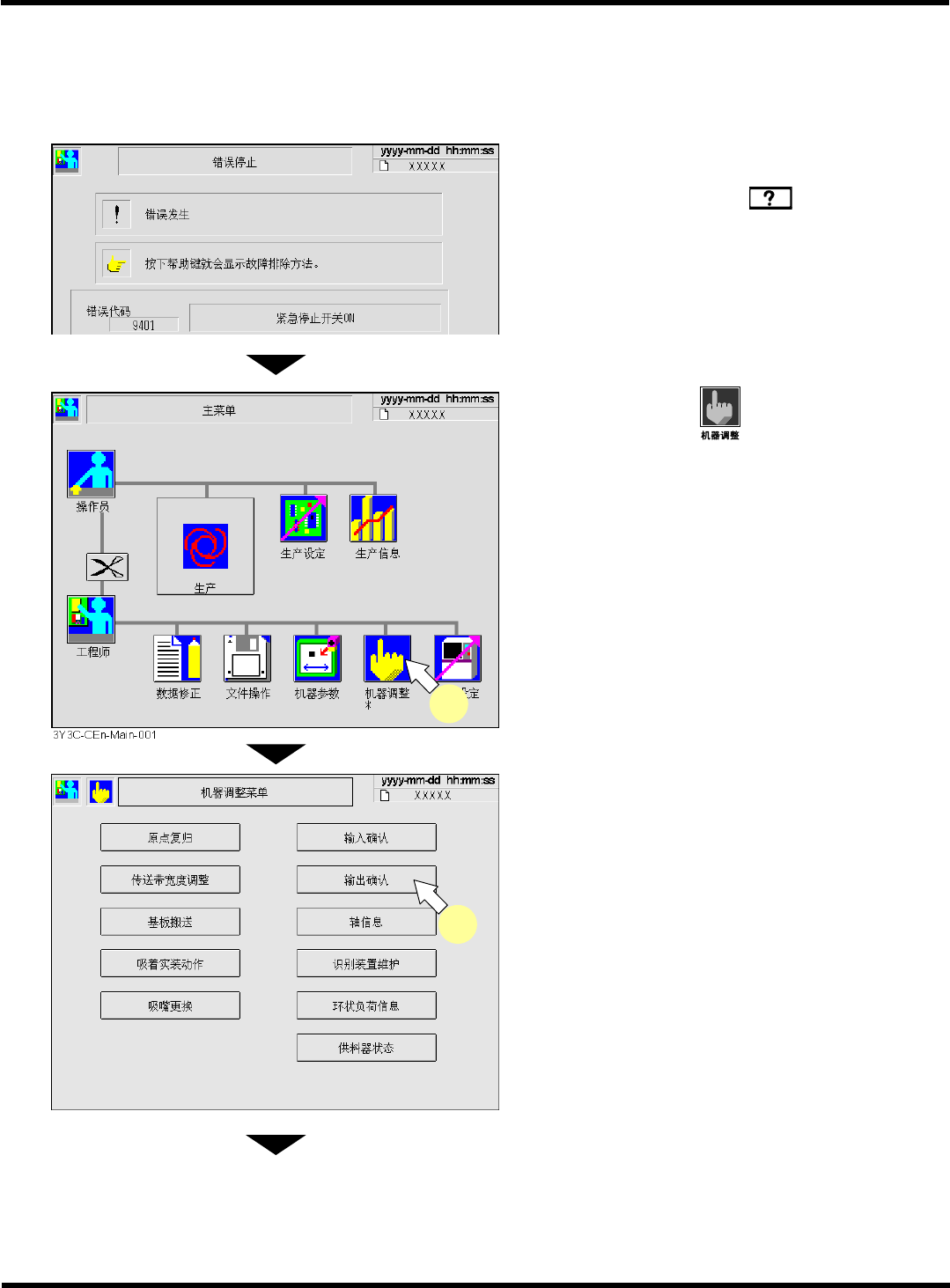 CM602-L 维修手册 3.9 机器的输入输出确 认 Pa ge 3- 94 5. 选择要确认的工作台。 • 画面为多功能吸头。 6. 按 [ 地址 ] 。 • < 输出确认 > 的地址画面将被 显示。 7. 按下在错误信息一览表中的地址名称开 关。 错误 代码 错误信息 I/O No. 地址 错误原因 9401 “ 紧急停止按钮 ON” 1143- 1080H bit0 1) 变为紧急停止开关被按 下的 状态。 2) 紧…